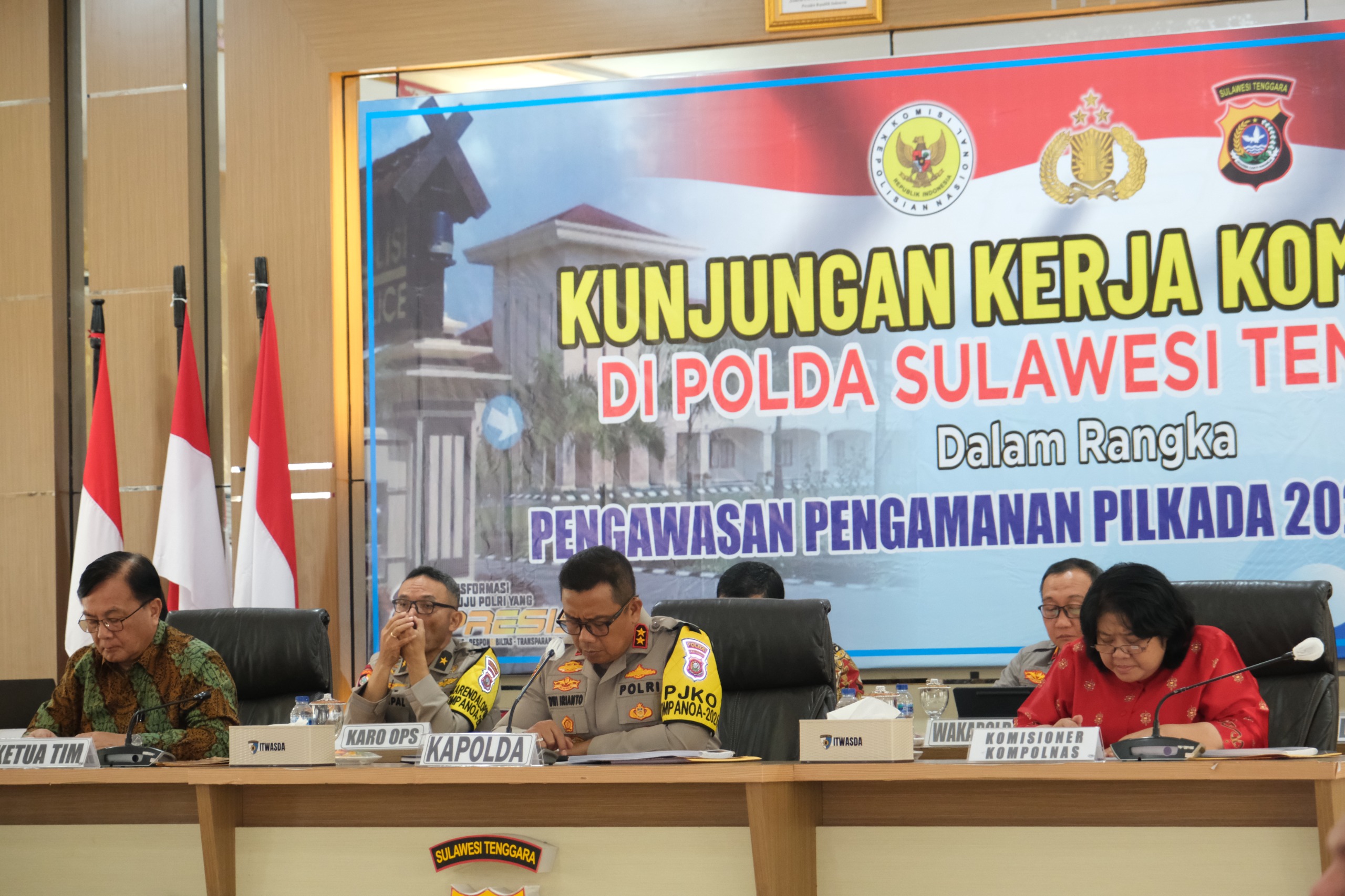Polda Sulawesi Tenggara menerima kunjungan kerja dari Komisi Kepolisian Nasional (Kompolnas) di Aula Dhacara Polda Sultra untuk membahas pengawasan dan persiapan pengamanan jelang Pilkada Serentak 2024. Kegiatan yang berlangsung pada pukul 13.30 WITA tersebut dihadiri oleh Kapolda Sultra Irjen Pol Dwi Irianto, S.I.K., M.H., Wakapolda Sultra Brigjen Pol Amur Chandra Juli Buana, S.H., M.H, Irwasda Polda Sultra Kombes Pol Hartoyo, S.I.K, Karo Ops Polda Sultra Brigjen Pol Tumpal Damayanus, S.H., M.H, serta Pejabat Utama (PJU) lainnya dari Polda Sultra.