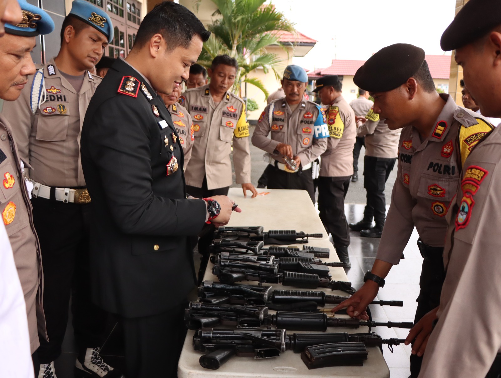 Kapolres Batola menggelar kegiatan Pemeriksaan Senjata Api (senpi) dinas, yang dipegang para personil Polres Batola, kegiatan dilaksanakan di ruang Lobi Mapolres Batola pada Senin 23/12/2024 pagi