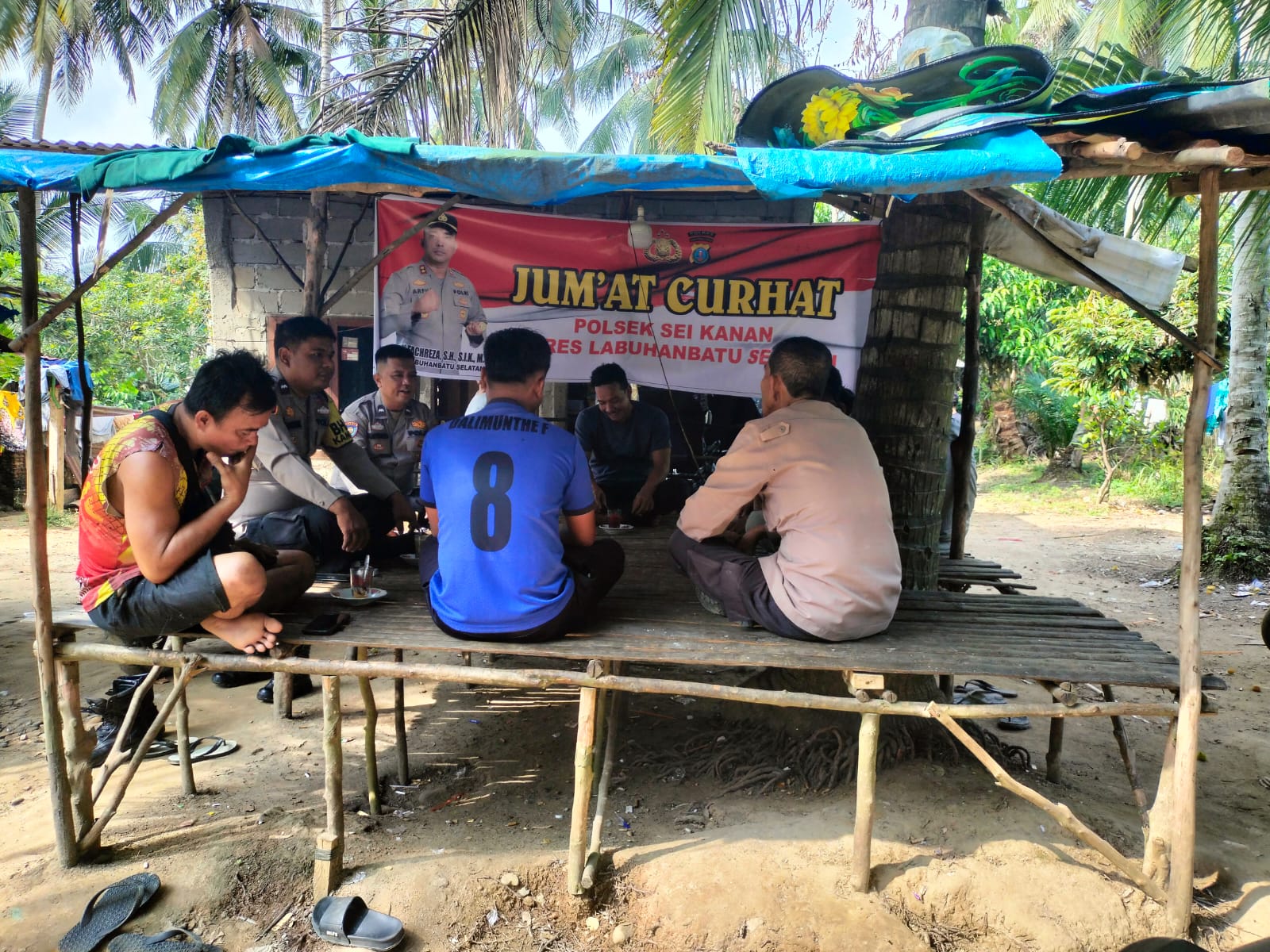 Personil Polsek Sei Kanan melaksanakan kegiatan *”Jumat Curhat”* yang berlangsung di Warung Ramli Nasution, Lingkungan Janji Manahan, Kelurahan Langgapayung, Kecamatan Sungai Kanan, Kabupaten Labuhanbatu Selatan, Jumat (27/12/2024).
