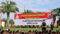 Suasana khidmat menyelimuti halaman Mapolres Paser saat pelaksanaan Upacara Kenaikan Pangkat bagi 19 personel Polres Paser dan Satuan Brimob Kompi 2 Batalyon C Pelopor. Upacara ini dipimpin langsung oleh Kapolres Paser, AKBP Novy Adi Wibowo, S.I.K., M.H., dan dihadiri oleh jajaran pejabat utama, para perwira, seluruh personel Polres Paser, serta Ketua Bhayangkari Cabang Paser, Ny. Selfa Novy, bersama para pengurus Bhayangkari.
