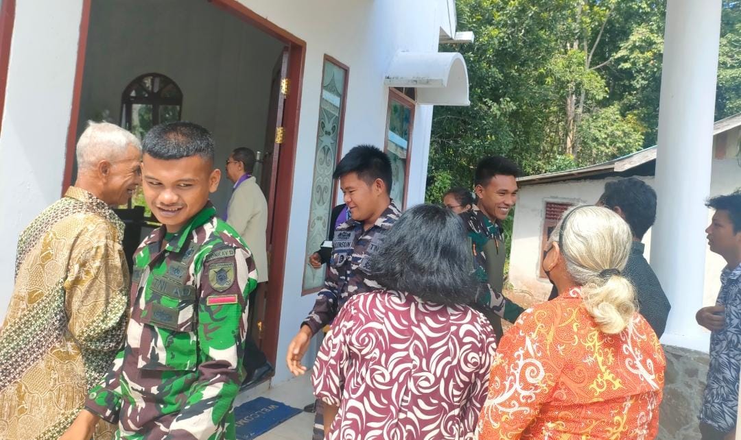 Usai ibadah Personil Satgas TMMD menyempatkan diri untuk berinteraksi dengan umat Kristen yang beribadah di Gereja untuk menjalin tali persaudaraan dan silaturahmi.