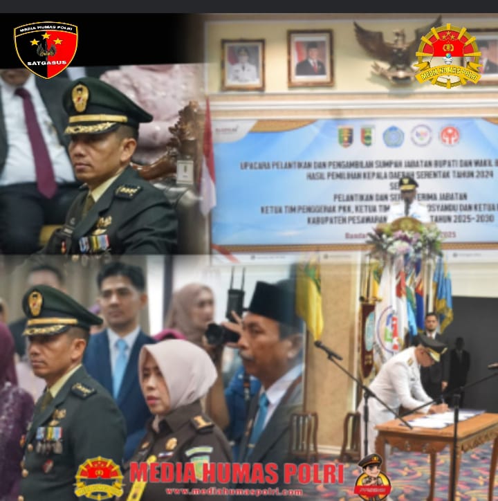 Kepala Staf Korem 043/Gatam Kolonel Inf Sumarlin Marzuki, S.E., M.Han., menghadiri pelantikan serta pengambilan sumpah jabatan Bupati dan Wakil Bupati Pesawaran periode 2025–2030, Hj. Nanda Indira B., S.E., M.M., dan Antonius Muhammad Ali, S.H., bertempat di Balai Keratun Lt. 3, Komplek Kantor Gubernur Lampung, Rabu (27/08/2025).