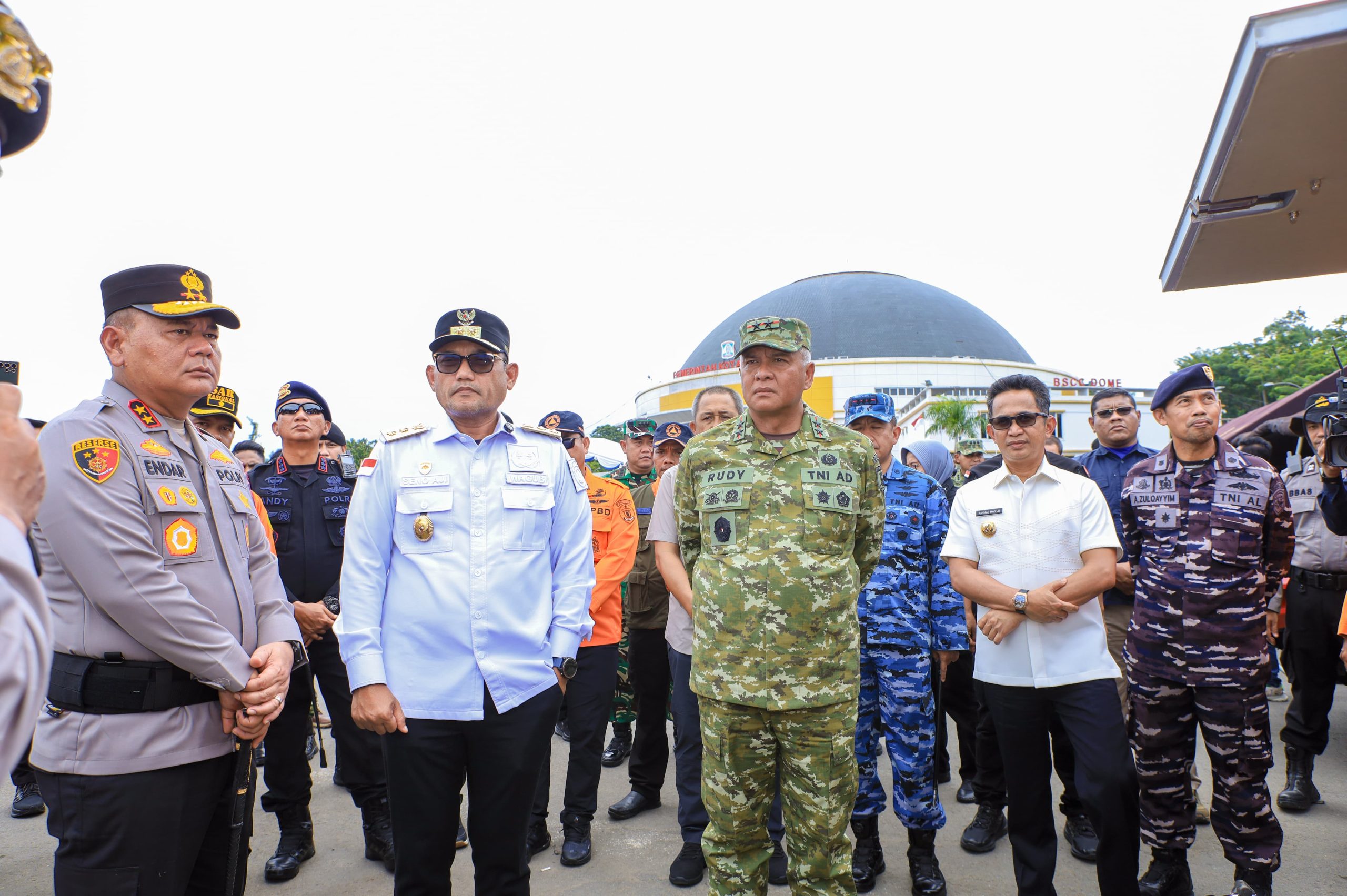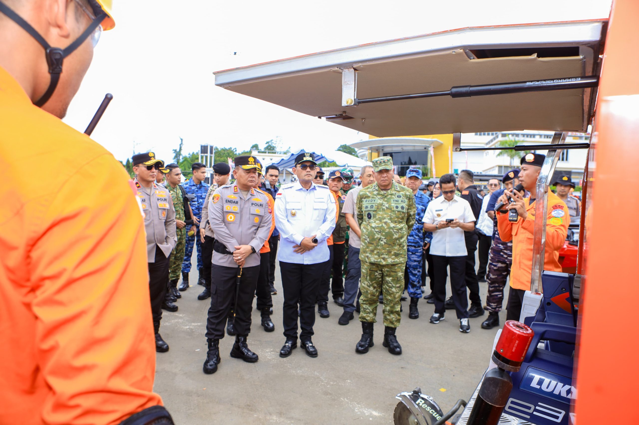 Pangdam VI/Mulawarman, Mayjen TNI Rudy Rachmat Nugraha, S.I.P., M.Sc., bersama Kapolda Kaltim Irjen Pol Endar Priantoro dan Wakil Gubernur Kaltim Ir. H. Seno Aji, M.Si., memimpin jalannya Simulasi Tanggap Darurat Bencana Hidrometeorologi di halaman BSCC Dome Balikpapan, Sabtu (06/12/25).