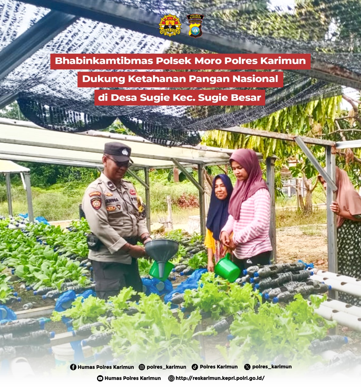 Dalam upaya mendukung Program Ketahanan Pangan Nasional, Bhabinkamtibmas Polsek Moro menyambangi lahan pertanian warga di Jl.Senyum RT.003 RW.003 Desa Sugie, Kamis (20/02). Kegiatan ini bertujuan mendorong warga agar memanfaatkan lahan kosong untuk meningkatkan produktivitas pertanian, khususnya di wilayah Kabupaten Karimun.