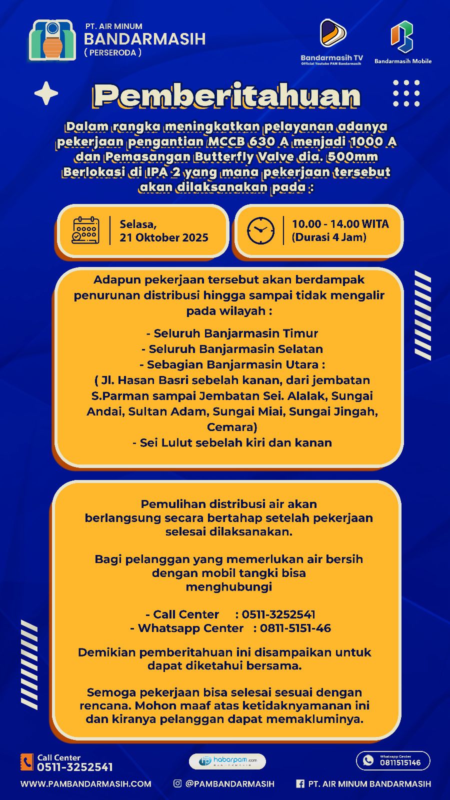 “Pendistribusian air akan mengalami penurunan tekanan hingga mati total saat pengerjaan berlangsung, dilakukan Selasa besok mulai pukul 10.00 sampai 14.00, kurang lebih selama 4 jam,” jelas Murjani Humas PT Air Minum Bandarmasih.