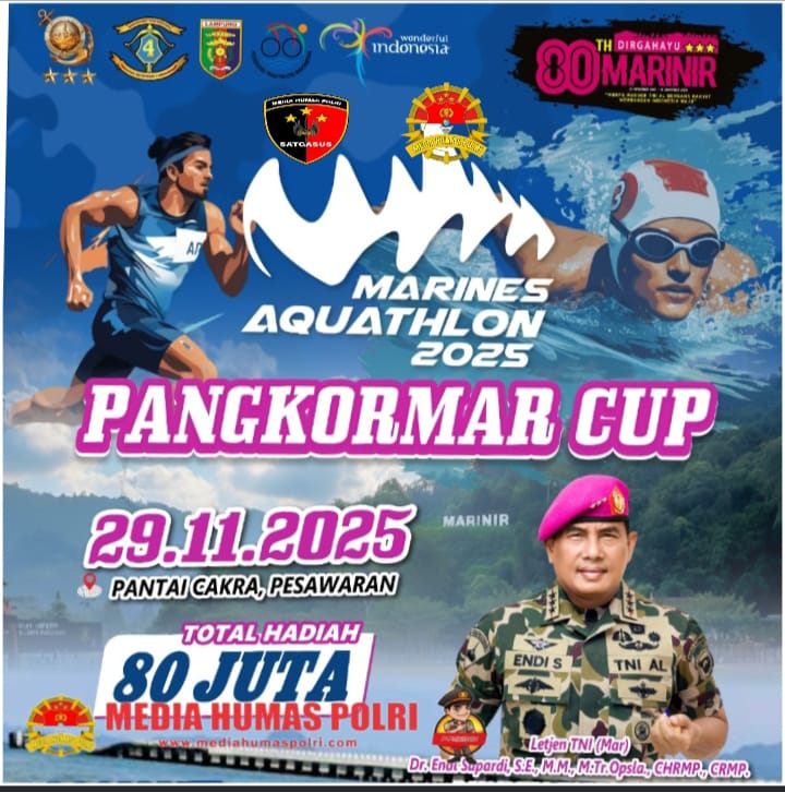 Dalam rangka memperingati HUT ke-80 Korps Marinir TNI AL, ajang olahraga bergengsi bertajuk Marine Aquathlon 2025 – Pangkormar Cup siap digelar di Pantai Cakra, Desa Batumenyan, Kecamatan Teluk Pandan, Kabupaten Pesawaran, Lampung, pada Sabtu, 29 November 2025.