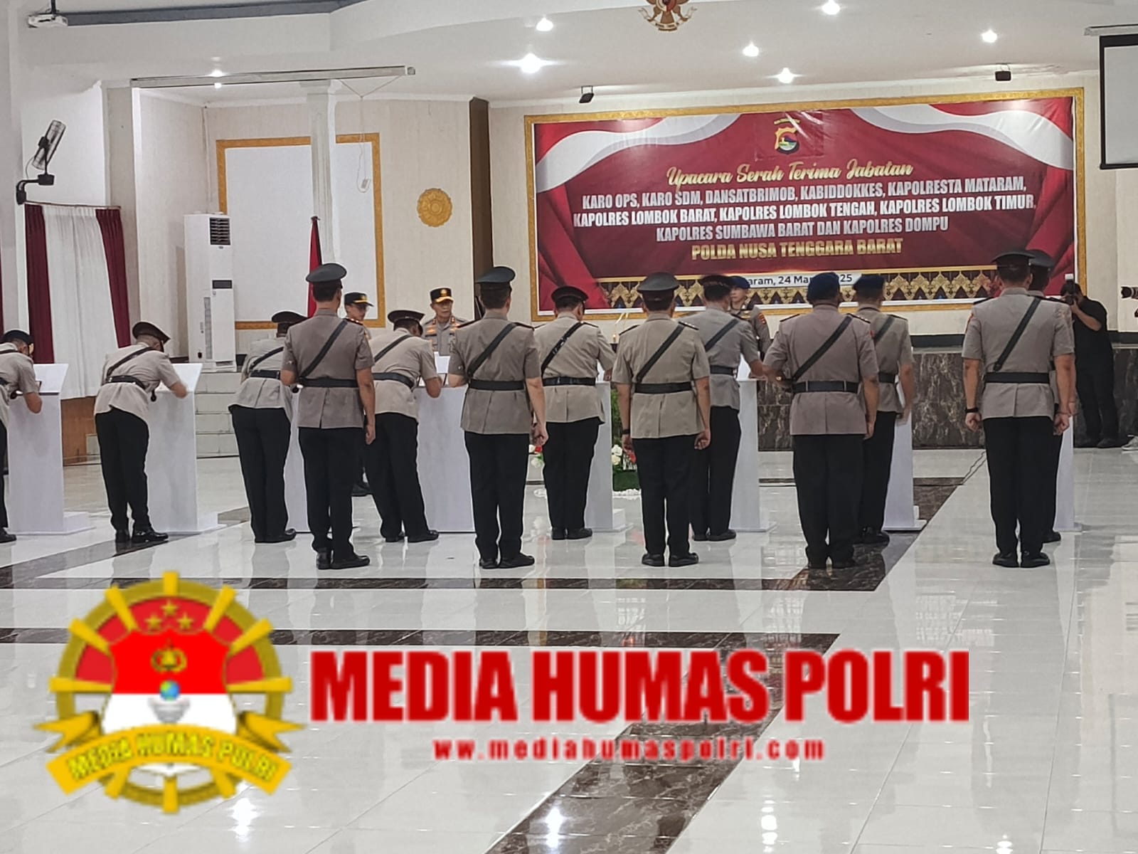 Serah terima jabatan berlangsung di Gedung Sasana Dharma Polda NTB dipimpin langsung oleh Kapolda NTB Irjen Pol. Hadi Gunawan SIK., yang dihadiri segenap Pejabat utama Polda NTB serta para perwira Polda NTB.