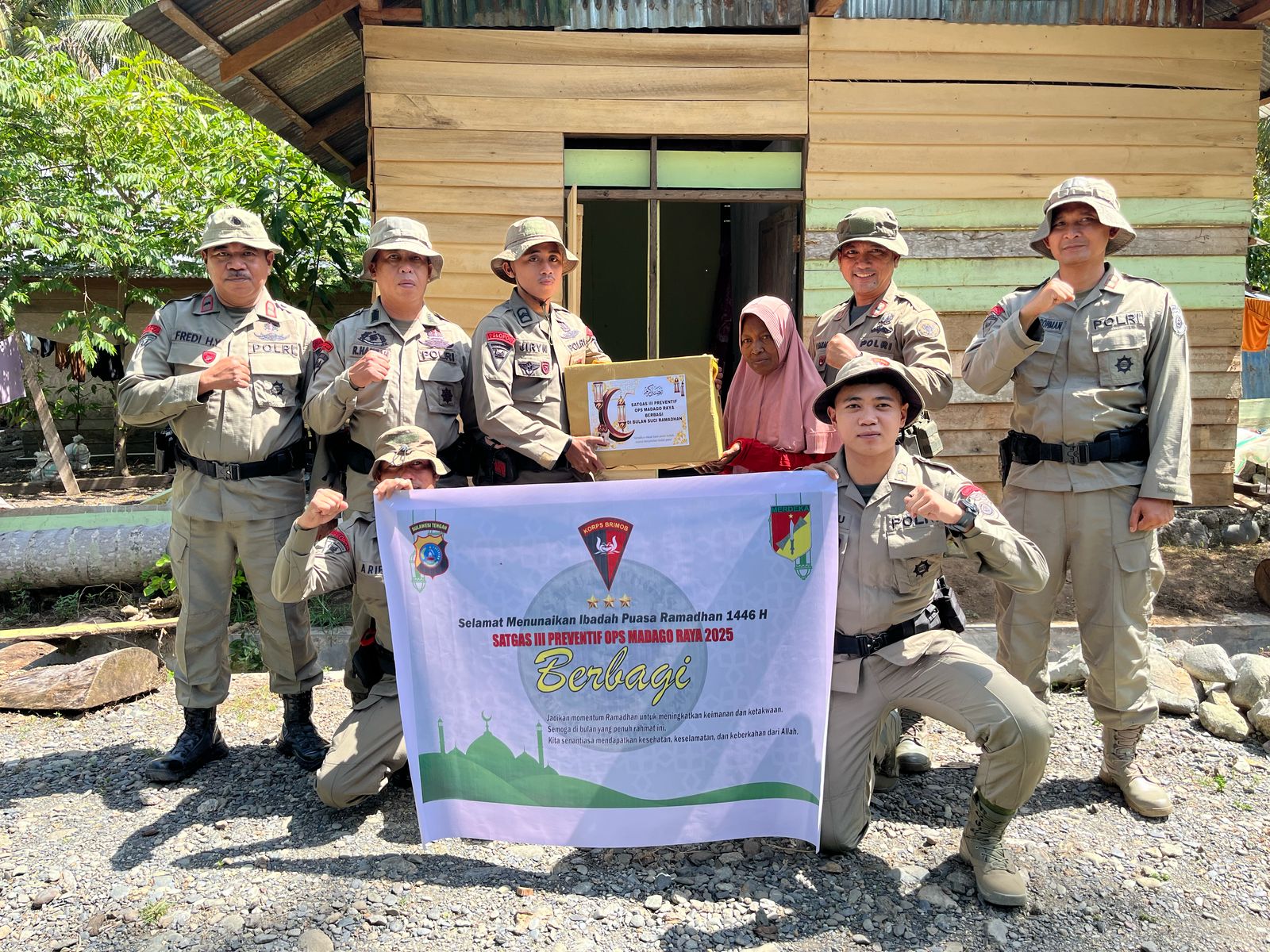 Dalam rangka semarak bulan suci Ramadhan, Satgas III Preventif Ops Madago Raya melaksanakan kegiatan berbagi sembako kepada masyarakat yang layak menerima santunan di Desa Kalora, Kecamatan Poso Pesisir Utara, pada Kamis (27/3/2025).