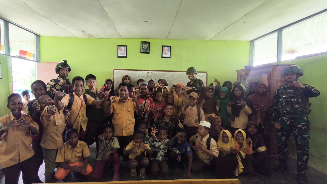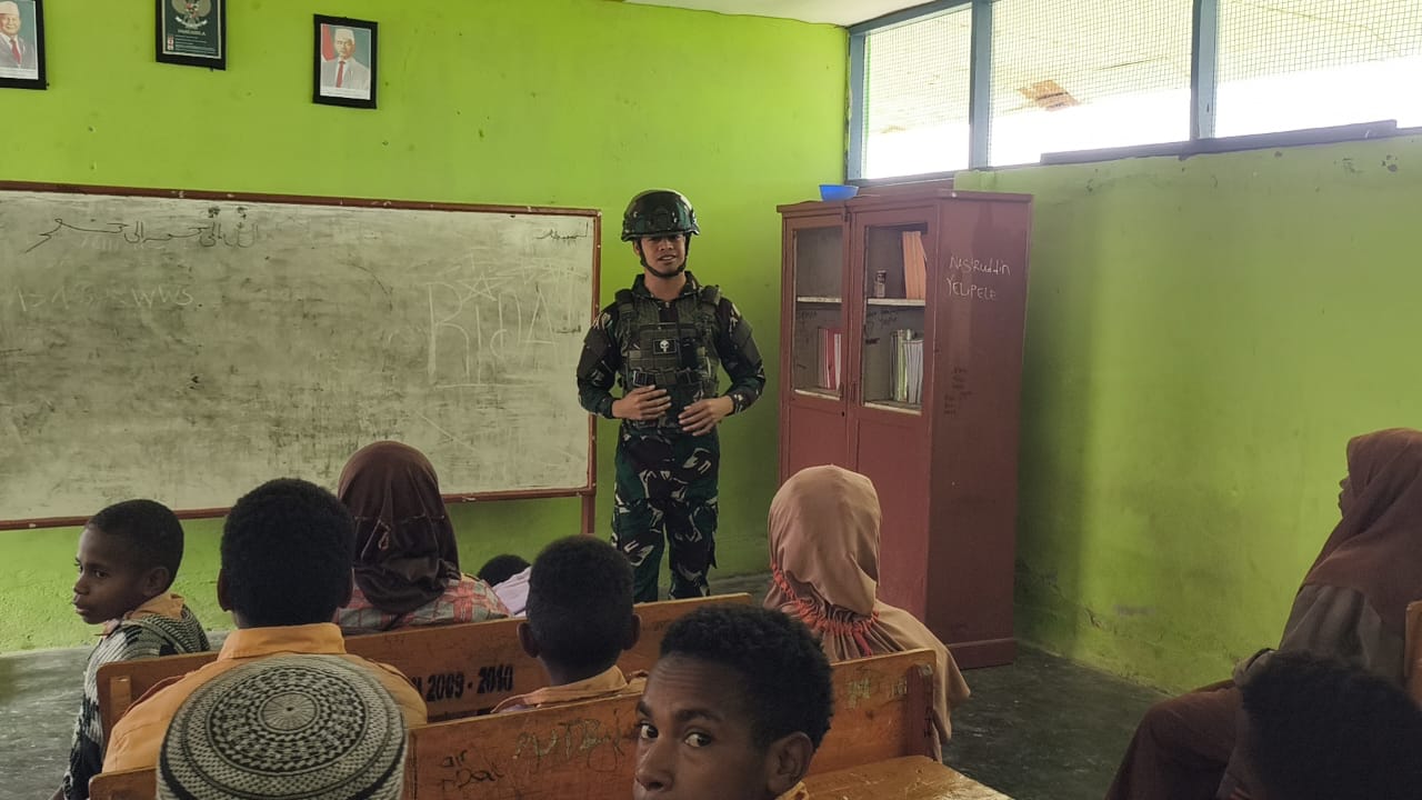 Satgas Yonif 521/DY melalui Pos Kotis Walesi membantu melaksanakan kegiatan mengajar bagi siswa siswi, Kegiatan mengajar itu dilaksanakan di Madrasah Ibtidaiyah (MI) Merassugun Asso Kampung Assoyelipele, Distrik Walesi, Kab. Jayawijaya, Papua Pegunungan.