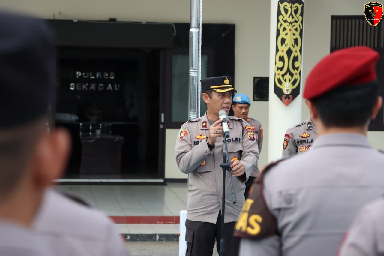 Wakapolres Sekadau Kompol Asep Mustopa Kamil, S.H., M.H., memberikan arahan kepada seluruh personel dalam apel jam pimpinan yang berlangsung di halaman Mapolres Sekadau, Senin (22/9/2025). Dalam kesempatan itu, ia menekankan pentingnya peran Polri untuk hadir sebagai penyejuk di tengah masyarakat dengan menjaga keamanan serta membangun narasi positif, khususnya di ruang digital.