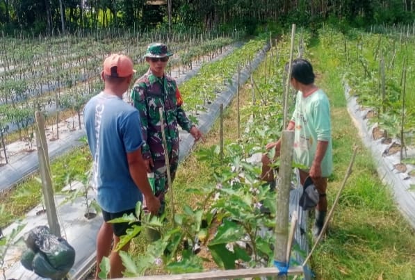 Babinsa Koramil 1002-03/Haruyan, Serda Hartawan melaksanakan komunikasi sosial (komsos) dengan Pak Husni, seorang petani terong di Desa Haruyan Seberang, Kecamatan Haruyan, Kabupaten Hulu Sungai Tengah, pada Minggu (6/7).