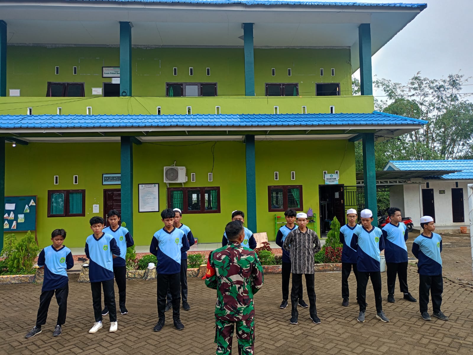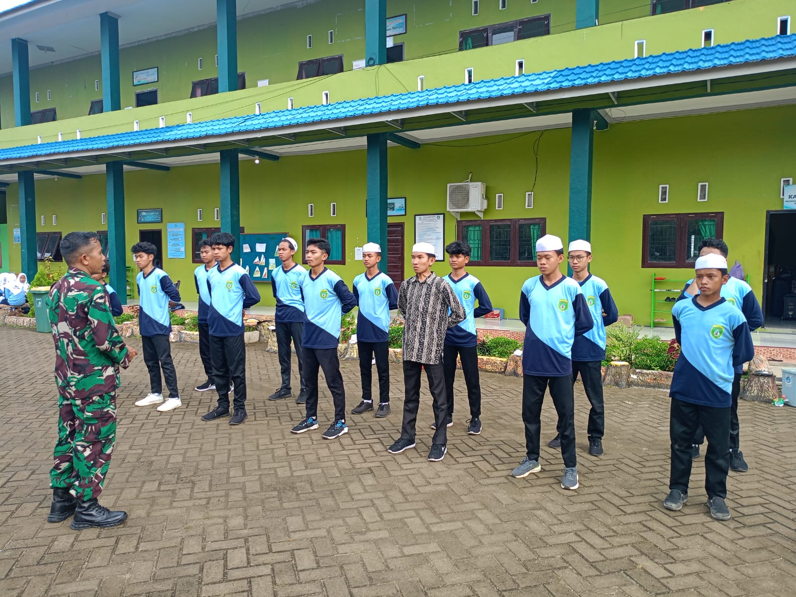 Sertu Agus Arahman, Bintara Pembina Desa (Babinsa) dari Komando Rayon Militer (Koramil) 1002-08/Labuan Amas Utara, melaksanakan kegiatan pembinaan karakter bangsa bagi siswa Madrasah Aliyah (MA) Muhajirin melalui pelatihan Peraturan Baris Berbaris (PBB).
