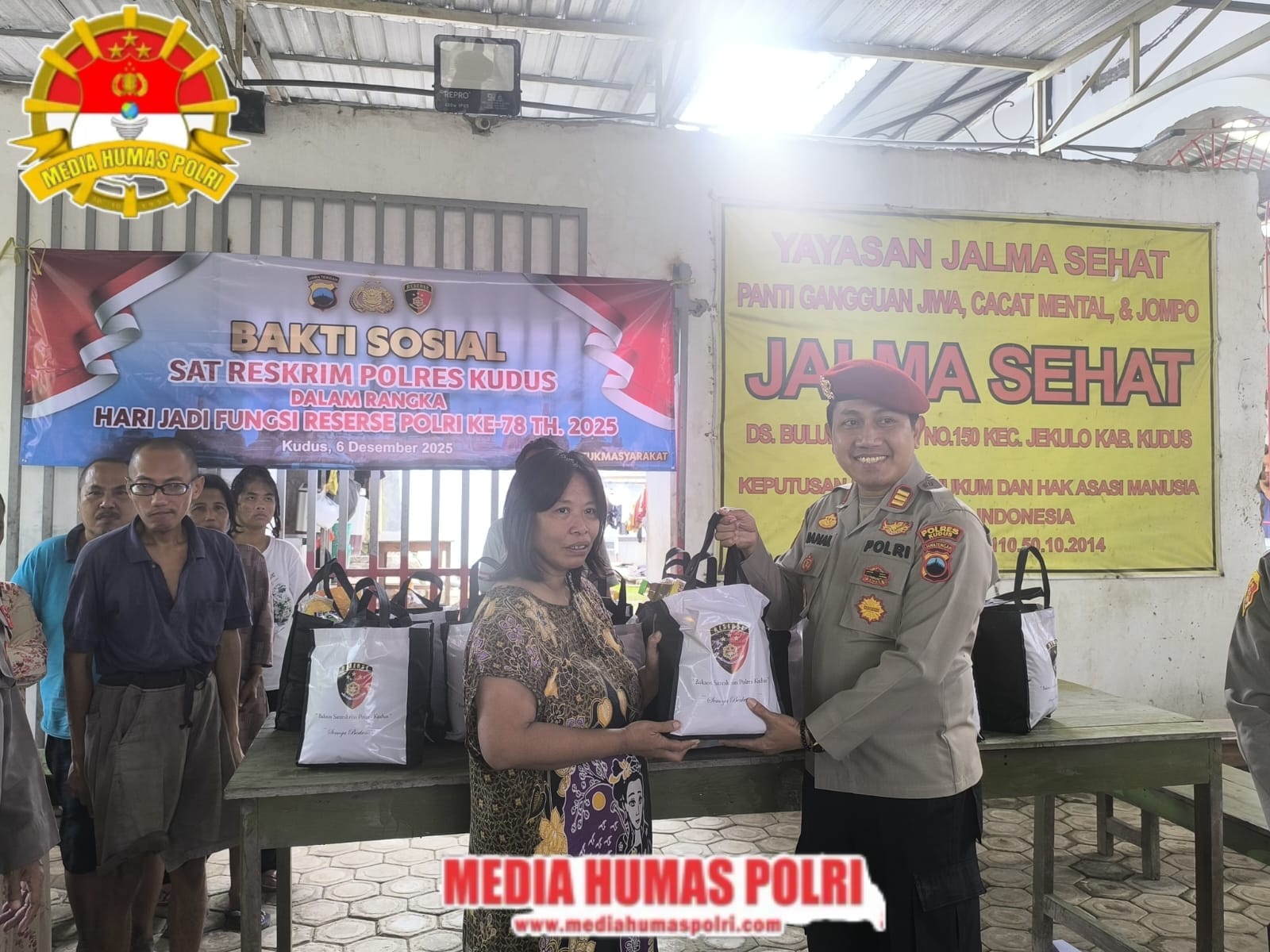 Satuan Reserse Kriminal Polres Kudus menggelar bakti sosial di Panti Jalma Sehat, Desa Bulung Kulon, Kecamatan Jekulo, Kudus pada Sabtu (6/12/2025).
