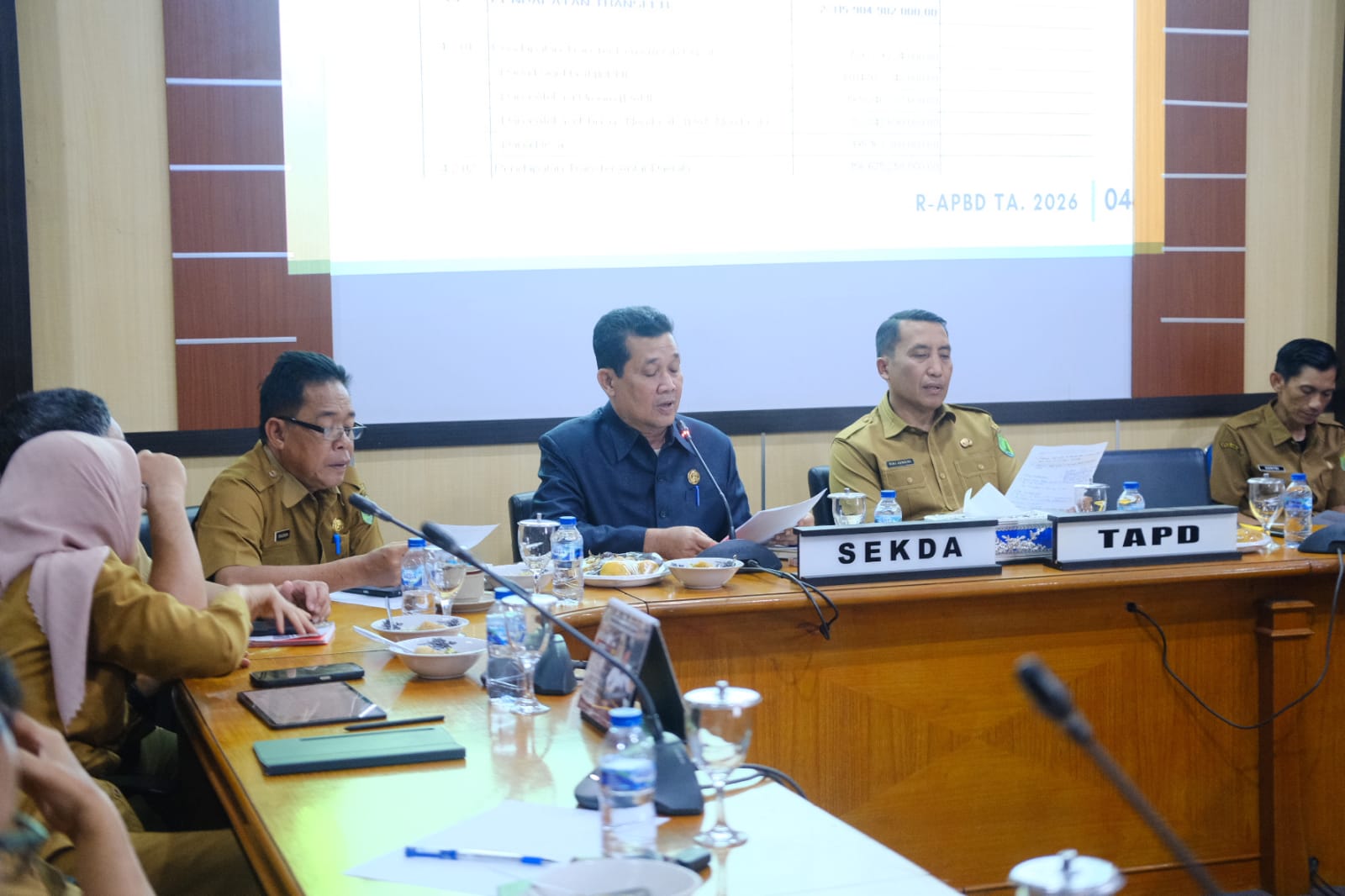 Pj Sekretaris Daerah Muba Drs Syafruddin MSi selaku Ketua TAPD menyampaikan ringkasan struktur R-APBD 2026 yang telah disetujui bersama dalam pembahasan Banggar.
