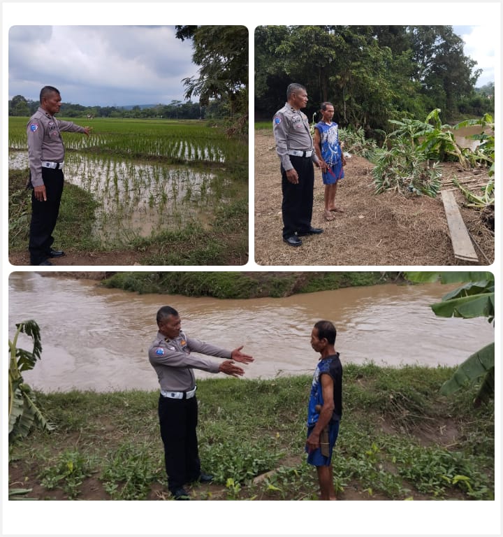” Bentuk peduli terhadap warga Bhabinkamtibmas, terjun langsung untuk monitoring keberadaan Kali yang diguyur hujan lebat, dan di sekitarnya banyak lahan sawah yang di tanami Padi milik warga Desa binaannya” Ujar IPDA Latip Marsal.