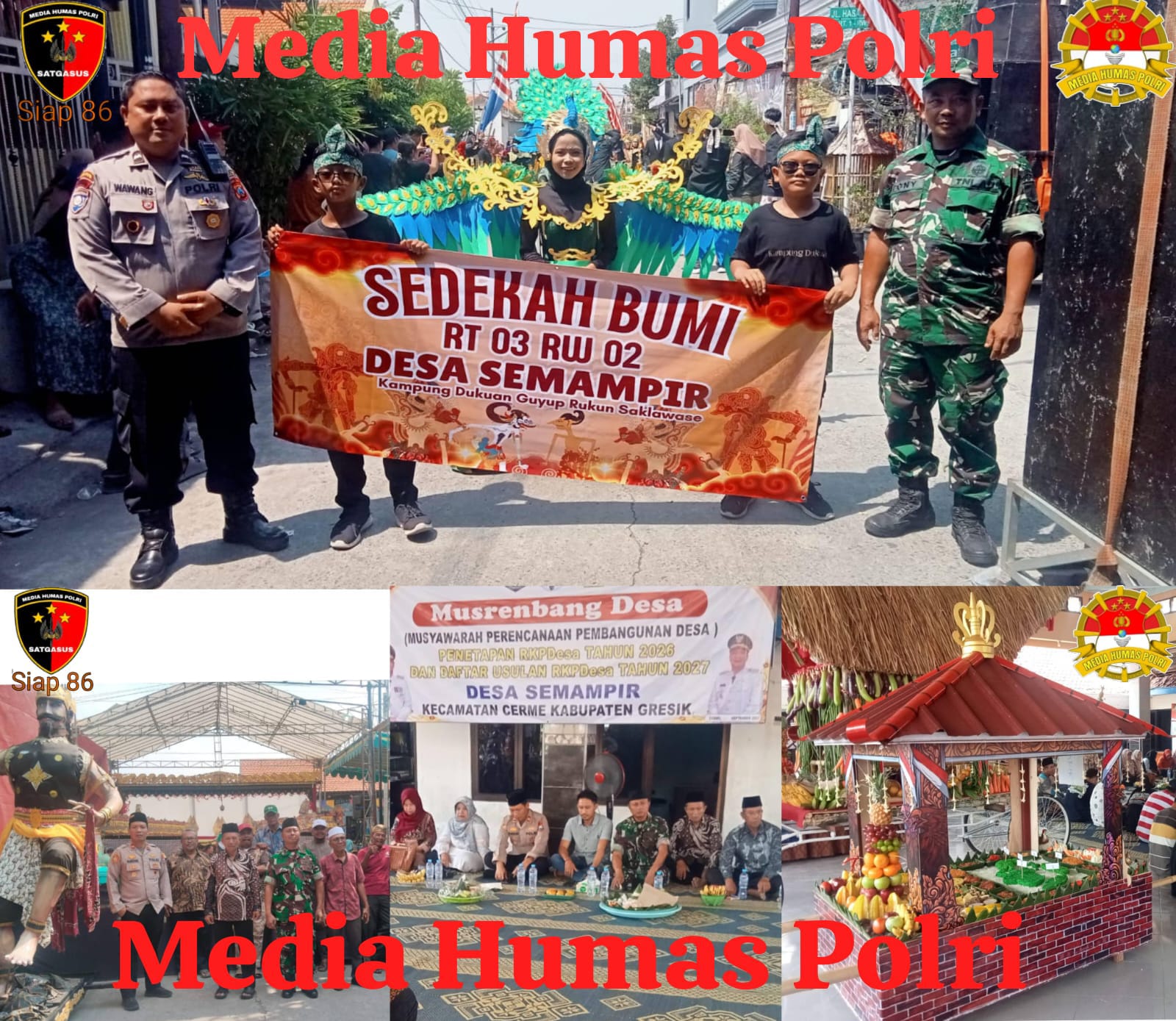 Bentuk rasa syukur warga dan melestarikan adat budaya P.J. Komandan Koramil 0817/08 Cerme, Kodim 0817/Gresik Peltu Suyanto yang didampingi Babinsa Semampir Sersan Dua Toni Nuswantoro bersama Bhabinkamtibmas Semampir Aipda Wawang Zulianto, menghadiri acara Tasyakuran Sedekah Bumi, yang dilaksanakan di Desa Semampir, Kecamatan Cerme, Kabupaten Gresik, pada hari Sabtu, tanggal (27 – September – 2025).