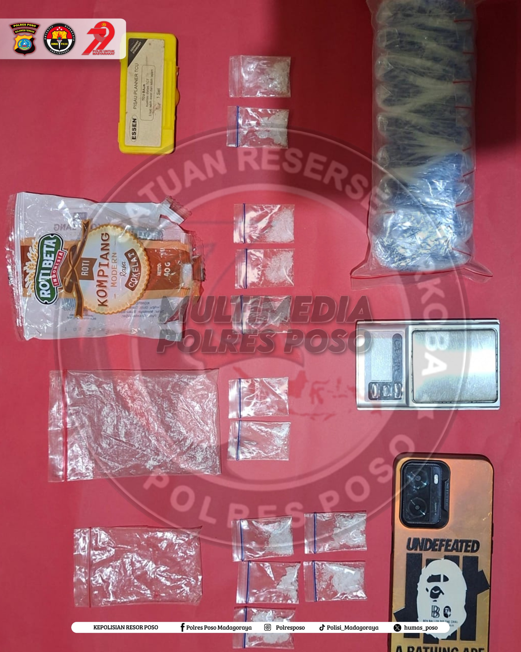 Dari hasil penggeledahan, tim Sat Resnarkoba Polres Poso menemukan barang bukti berupa 12 paket plastik centik bening yang diduga narkotika jenis sabu dengan berat bruto 9,24 gram. Selain itu, juga diamankan satu unit handphone Oppo, satu buah timbangan digital, dan satu unit sepeda Coyote.