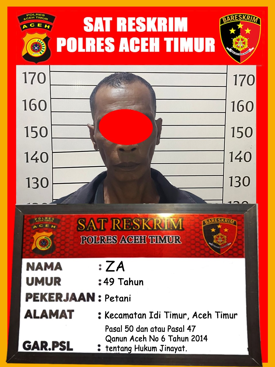 Kasat Reskrim Polres Aceh Timur Iptu Adi Wahyu Nurhidayat, S.TrK.,S.I.K. menyebutkan, pelaku berinisial ZA (49) warga Kecamatan Idi Timur, Kabupaten Aceh Timur.