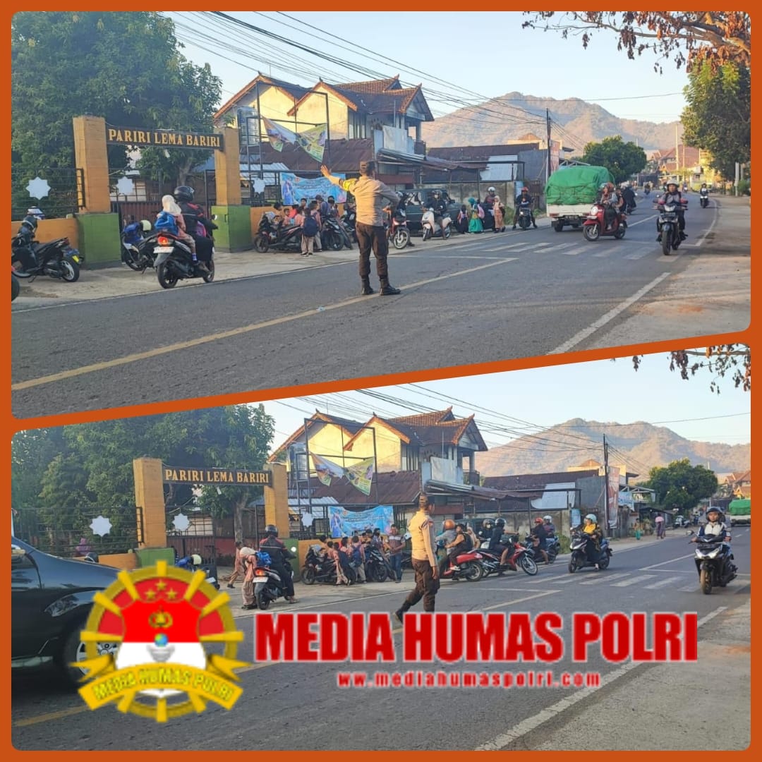 Polsek Taliwang memberi pelayanan keamanan lalu lintas bagi siswa, guru dan orang tua/wali menggelar strong point dengan melakukan penjagaan di jalan raya di depan SDN 2 Taliwang.