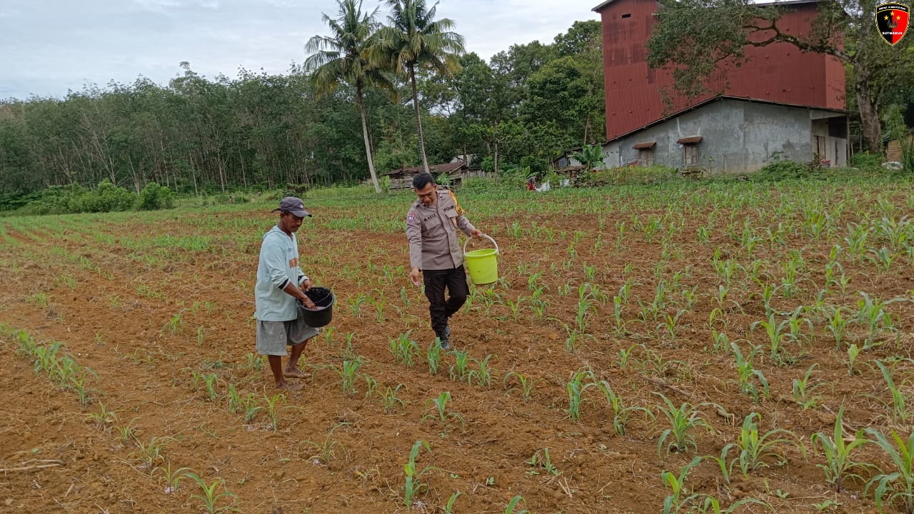 Bhabinkamtibmas Desa Sungai Melayu Rayak, Polsek Tumbang Titi Polres Ketapang, bersama dengan petani setempat, melaksanakan kegiatan pemantauan perkembangan tanaman jagung hibrida dan pemberian pupuk secara langsung di lahan pertanian, pada Selasa (25/02/2025).