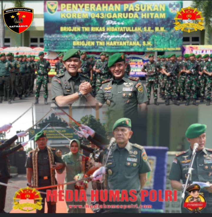 Dalam rangkaian kegiatan Serah Terima Jabatan Komandan Korem 043/Garuda Hitam (Gatam), telah dilaksanakan Apel Penyerahan Pasukan dari pejabat lama Brigjen TNI Rikas Hidayatullah, S.E., M.M. kepada Brigjen TNI Haryantana, S.H. selaku Danrem 043/Gatam yang baru. Kegiatan ini digelar di Lapangan Upacara Makorem 043/Gatam, Jl. Teuku Umar, Penengahan, Bandar Lampung, pada Kamis (7/08/2025).