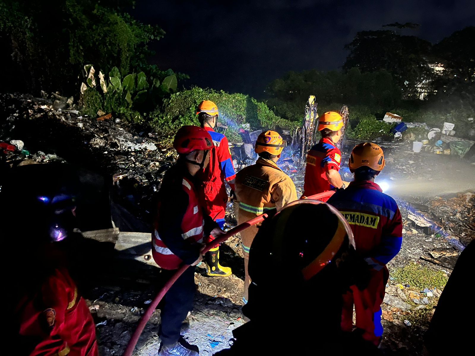 Petugas gabungan bersama warga bahu-membahu memadamkan kobaran api yang berasal dari tumpukan sampah di lahan kosong. Upaya cepat ini berhasil mencegah api meluas ke kawasan permukiman.
