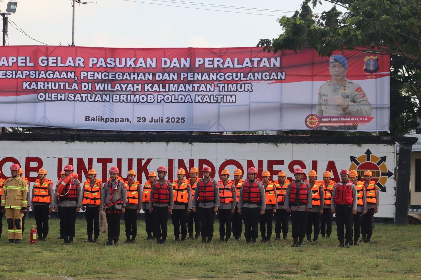 Mengantisipasi meningkatnya risiko kebakaran hutan dan lahan (karhutla) akibat perubahan cuaca ekstrem, Satuan Brimob Polda Kalimantan Timur menggelar Apel Kesiapsiagaan Personel dan Peralatan di Lapangan M. Jasin, Mako Stalkuda Brimob, Balikpapan, Selasa (29/7/2025).
