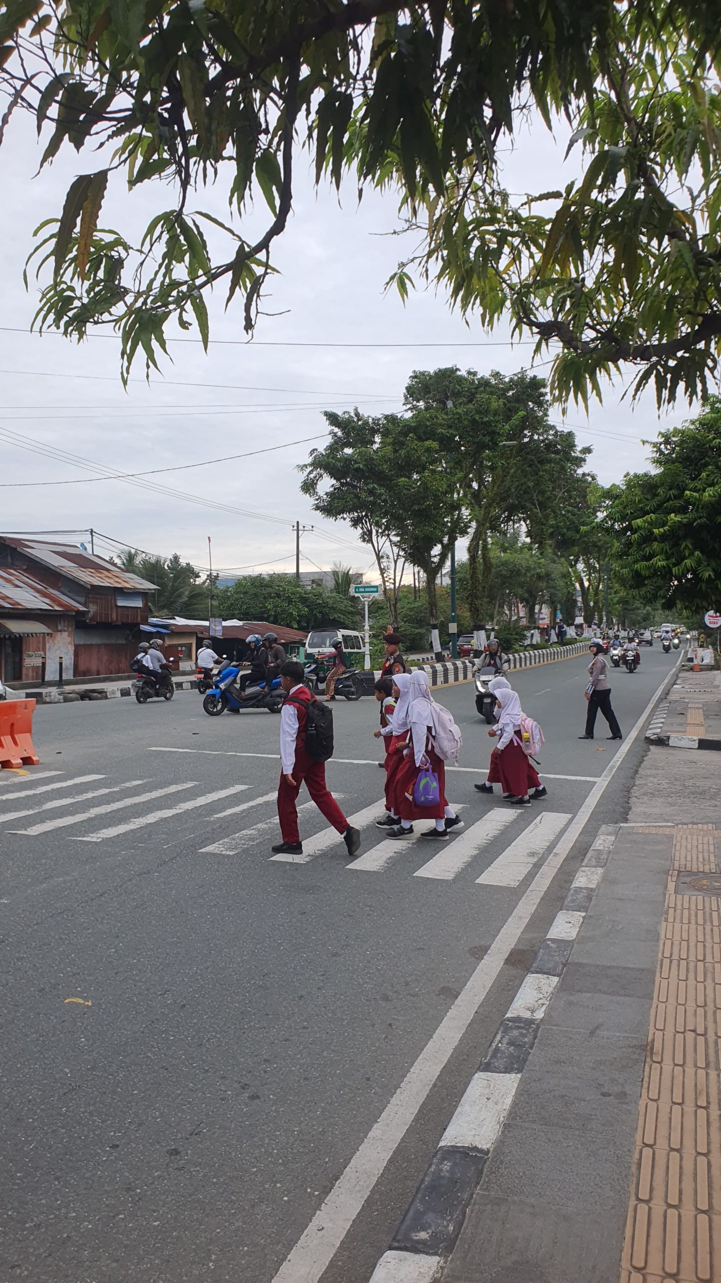 Dengan sigap, personel Brimob menghentikan sejenak laju kendaraan dan mengamankan jalur penyeberangan. Hal ini dilakukan untuk memastikan para siswa dapat menyeberang jalan dengan aman dan tertib saat hendak memasuki lingkungan sekolah. Kehadiran anggota Brimob di lokasi tersebut memberikan rasa aman bagi para pelajar dan orang tua yang mengantar.