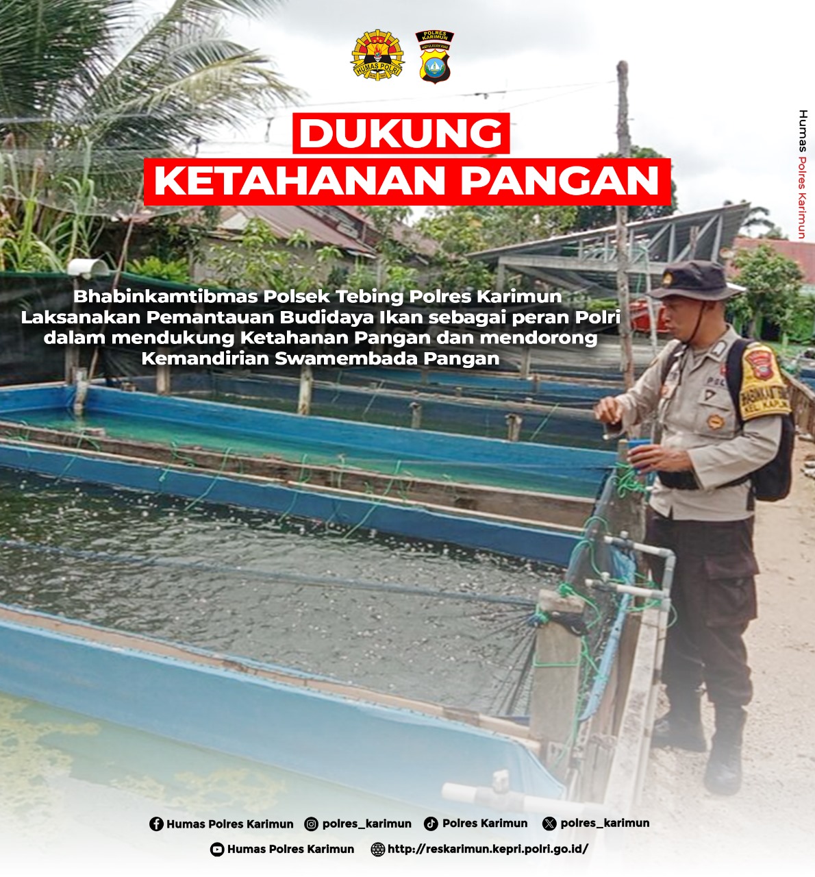 Dalam upaya mendukung Program Ketahanan Pangan Nasional, Bhabinkamtibmas Polsek Tebing menyambangi lahan Kolam lele warga di Jl. Sungai Ayam RT 03 RW 03 Kel. Kapling Kec. Tebing Kab. Karimun, Rabu (19/02). Kegiatan ini bertujuan mendorong warga agar memanfaatkan lahan kosong untuk meningkatkan produktivitas peternakan lele, khususnya di wilayah Kabupaten Karimun.