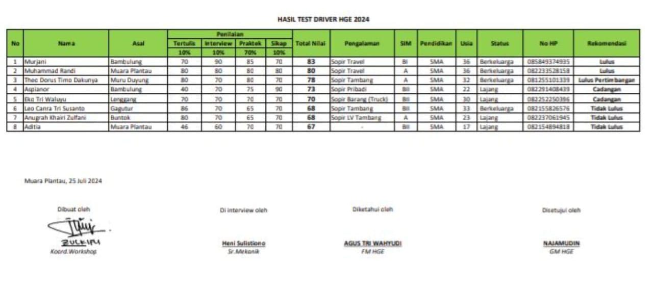 Aneh bin ajaib,di tahun 2024 ikut uji calon Sopir di PT Sawit HGE,info lulusan baru ketahuan peserta baru sekitar September 2025 daftar kelulusan uji calon Supir,itupun diketahui peserta dari pihak luar Perusahaan PT Sawit HGE,dan saat ditanyakan saksi korban malah dituding mengambil dokumen rahasia perusahaan oleh oknum pejabat di PT HGE