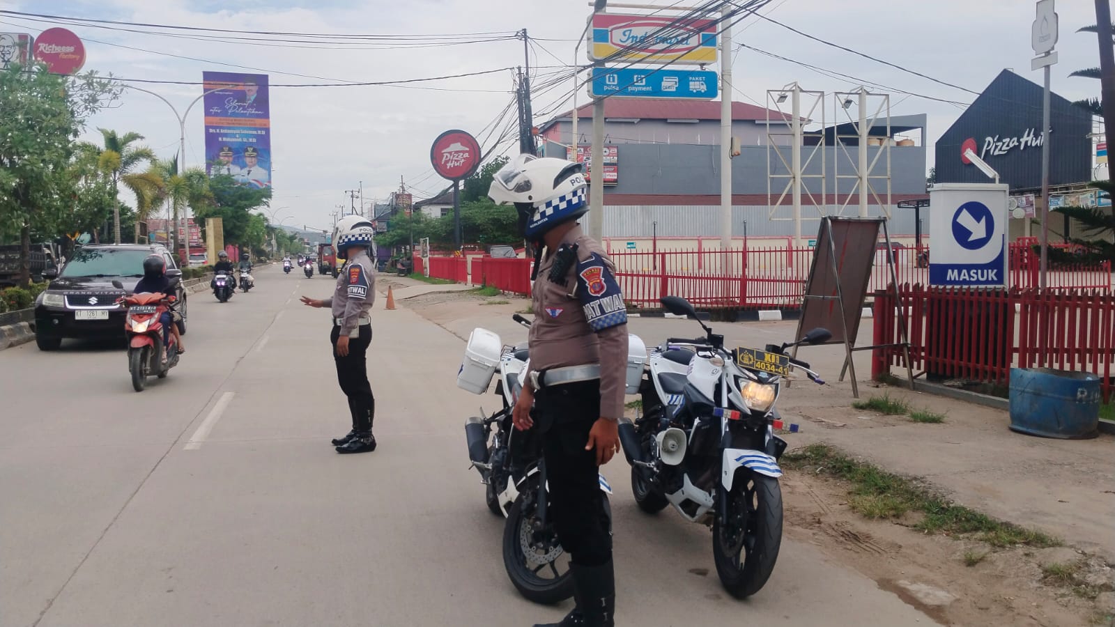 Personel Satlantas memberikan imbauan kepada pengendara agar selalu mematuhi peraturan lalu lintas, menggunakan helm standar, serta tidak berkendara melebihi batas kecepatan.