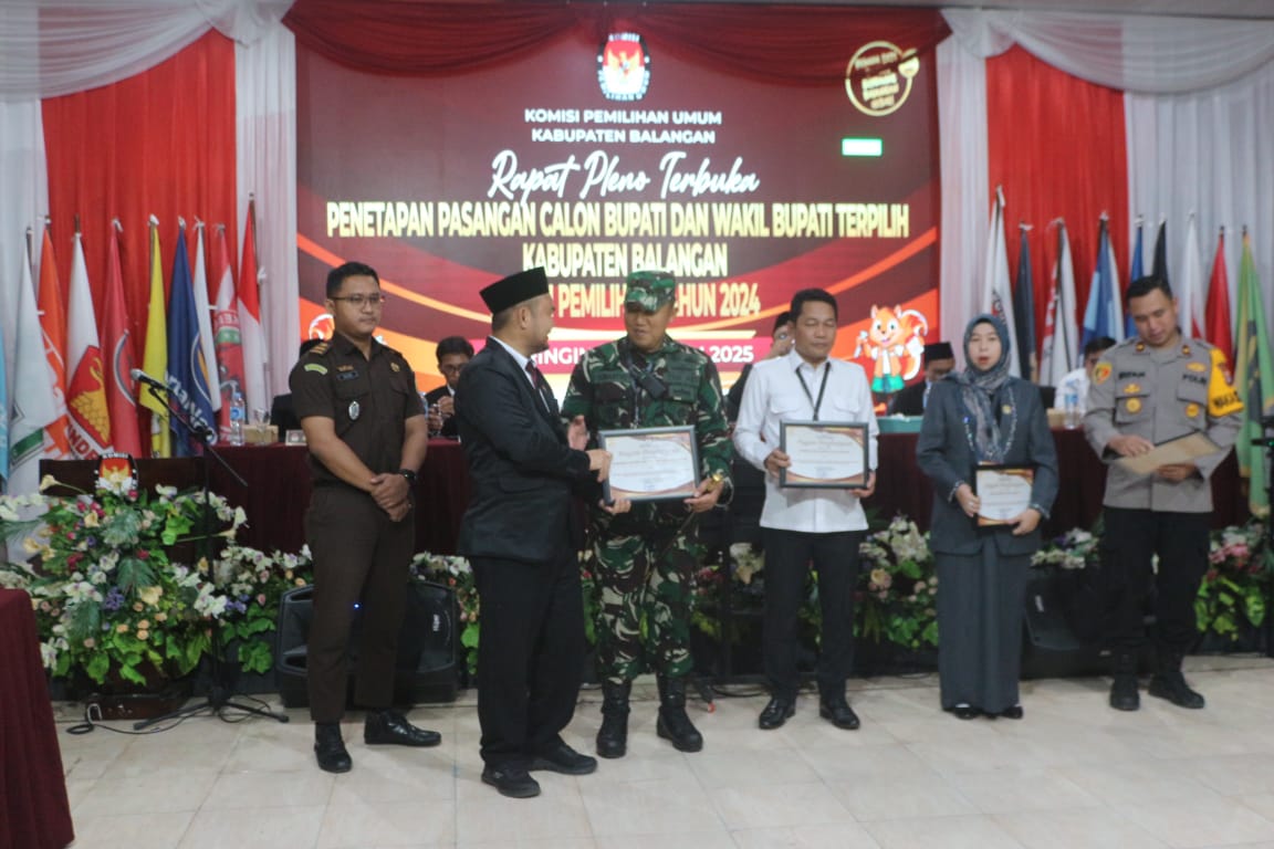 Komandan Kodim 1001/HSU-BLG Letkol Kav Gunantyo Ady Wiryawan, S.Hub.Int., Menghadiri Kegiatan Rapat Pleno Terbuka Penetapan Pasangan Calon Terpilih Bupati dan Wakil Bupati Kabupaten Balangan dalam pemilihan serentak 2024 Bertempat di Aula Kantor KPU Kabupaten Balangan, jl A.Yani Km 6, Kelurahan Batu Piring, Kecamatan Paringin Selatan, Kabupaten Balangan. Kamis Pagi (09/01/2025).