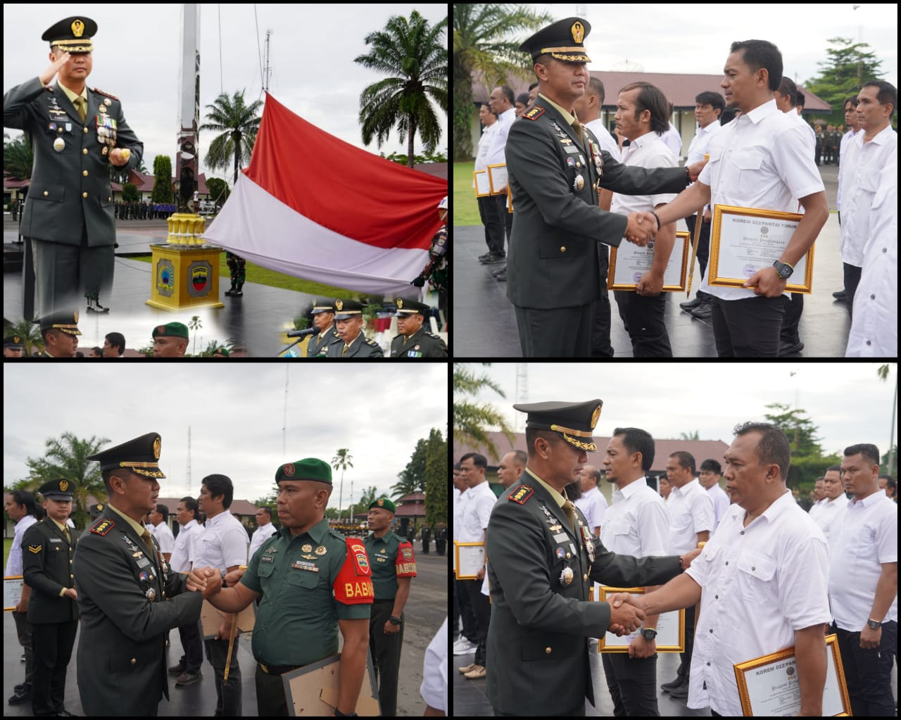 Seusai melaksanakan upacara peringatan Hari Pahlawan Tahun 2025, Komandan Korem 022/Pantai Timur Kolonel Inf Sandi Kamidianto, S.I.P., M.I.P., memberikan piagam penghargaan kepada personel jajaran Korem 022/Pantai Timur karena berhasil melakukan penindakan narkoba di wilkayah Korem 022/PT, bertempat di lapangan Jend. Soedirman Makorem 022/PT Jalan Asahan Km 3,5 Kecamatan Siantar Kabupaten Simalungun Sumut. Senin (10/11/2025).