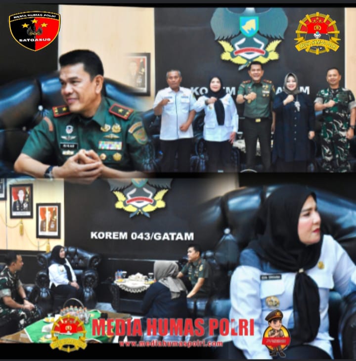 Komandan Korem 043/Gatam Brigjen TNI Rikas Hidayatullah, S.E., M.M., didampingi Dandim 0410/KBL Letkol Arm Roni Hermawan, Ketua Persit Kartika Chandra Kirana Koorcab Rem 043 PD II/Sriwijaya Ibu Hanny Rikas Hidayutullah, menyambut kunjungan kerja Wali Kota Bandar Lampung Hj. Eva Dwiana. Kegiatan berlangsung di Ruang Lobi Utama Makorem 043/Gatam, Jalan Teuku Umar, Penengahan, Bandar Lampung.18/6/2025
