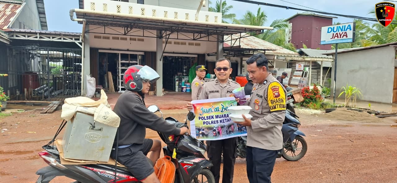 Personel Polsek Muara Pawan Polres Ketapang menggelar kegiatan sosial dengan membagikan puluhan nasi kotak secara gratis kepada para pengendara yang melintas di depan Mapolsek Muara Pawan, pada Jumat (17/10/2025) siang. Kegiatan ini merupakan bagian dari program Jubah Mas yaitu Jumat Berkah Kamtibmas yang secara rutin dilaksanakan oleh Polsek Muara Pawan sebagai bentuk kepedulian terhadap masyarakat.