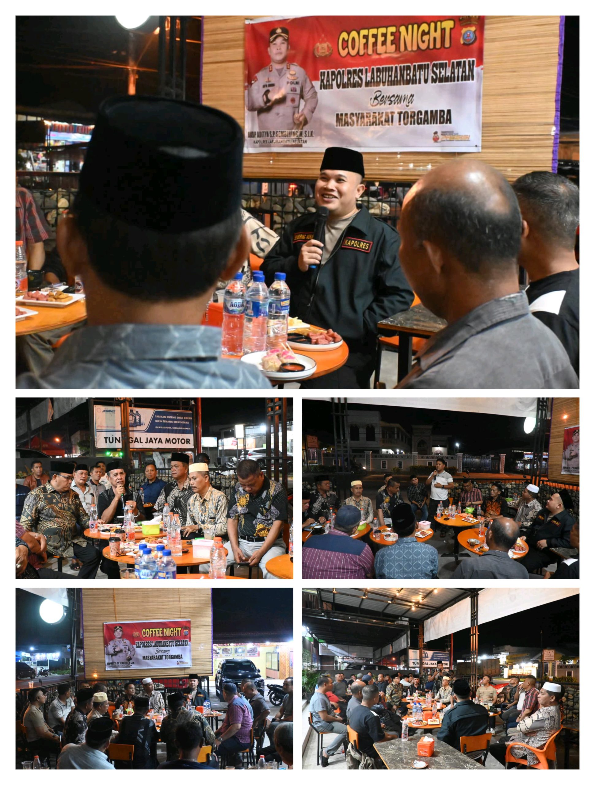 Kapolres Labuhanbatu Selatan, AKBP Aditya S.P. Sembiring M, S.I.K., bersama Wakapolres KOMPOL Ramsen Samosir, S.H., M.H., para PJU, Kapolsek Torgamba, AKP Syamsul Adhar, S.H., M.H., dan personel Polres Labuhanbatu Selatan dan Polsek Torgamba menggelar kegiatan bertajuk *”Coffe Night – Ngopi Kamtibmas”* untuk mendengarkan langsung keluhan dan masukan dari masyarakat.