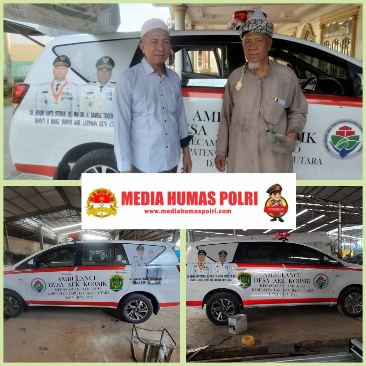 Pemerintah Desa Aek Korsik Kecamatan Aek Kuo Kabupaten Labuhan Batu Utara dalam perhatiannya untuk memenuhi kebutuhan warganya, khususnya di bidang transportasi kesehatan, Kepala Desa Aek Korsik mendatangkan 1(satu) unit mobil Ambulance Baru jenis Innova Reborn tahun 2024 sesuai dengan Musdes APBDes-P tahun 2024, pada Sabtu 15 Maret 2025.