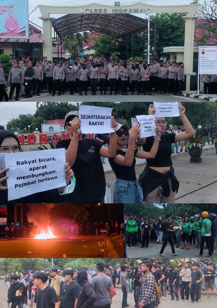 Ratusan demonstran gabungan mahasiswa dan pengemudi ojek online (ojol) menggelar aksi protes di depan Markas Polres Indramayu, Jawa Barat, pada Jumat (29/8/2025). Aksi yang dimulai secara damai berubah ricuh hingga malam hari, dipicu oleh kekecewaan atas kematian seorang driver ojol yang tewas terlindas kendaraan taktis (rantis) Brimob saat demo di Jakarta.
