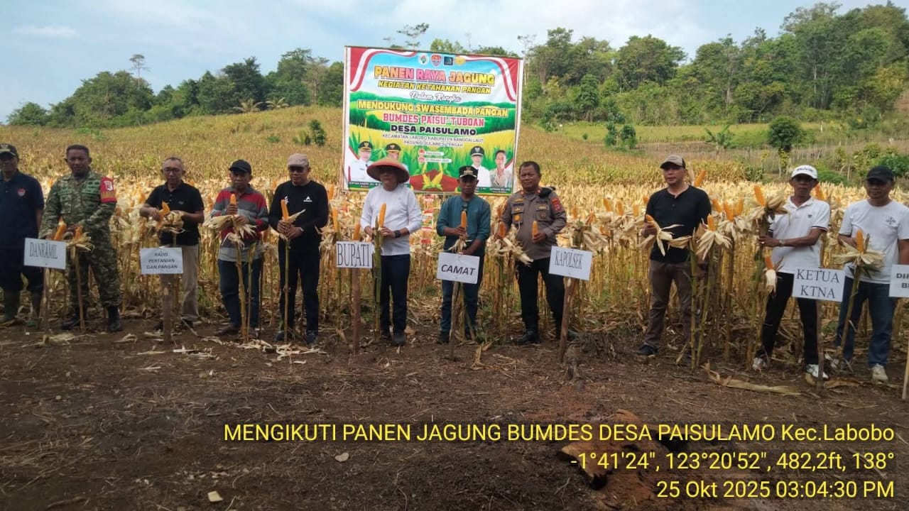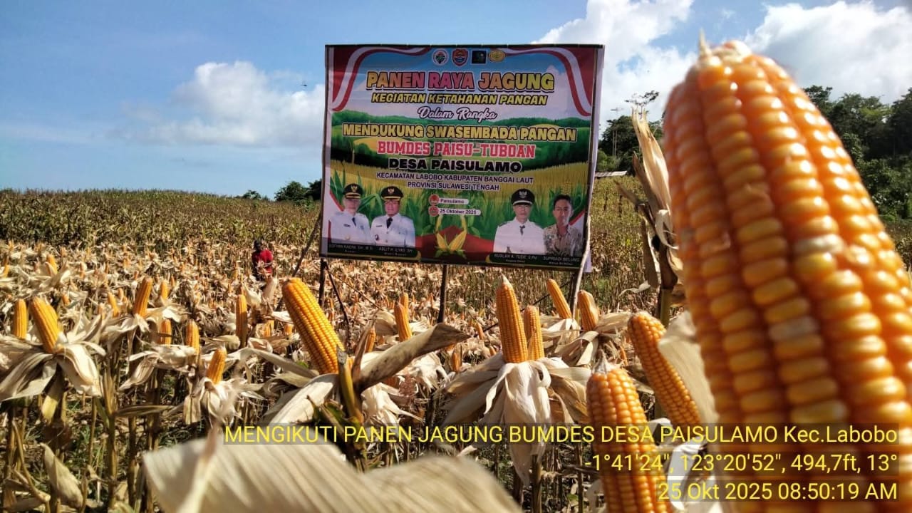 Bupati Banggai Laut, Sofyan Kaepa, SH., M.Si menghadiri Panen Raya Jagung Bisi Dua di Desa Paisulamo, Kecamatan Labobo. Kegiatan ini merupakan hasil kerjasama antara BUMDes Paisu tuboan Desa Paisulamo dan kelompok tani lokal.