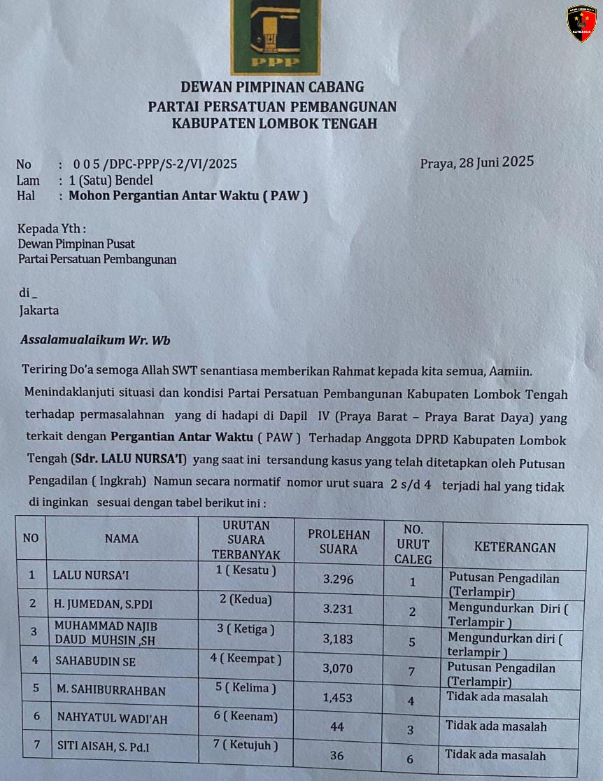 Surat permohonan PAW itu ditandatangani oleh Ketua DPC PPP Loteng H. Mayuki S. Ag. dan Sekretaris Ahmad Sukandi M. Pdi (28 Juni 2025). DPC PPP Kabupaten Lombok Tengah berharap DPP PPP di Jakarta dapat memberikan rekomendasi untuk pengajuan PAW ini. Dengan demikian, proses pergantian antar waktu dapat dilakukan sesuai dengan prosedur yang berlaku.