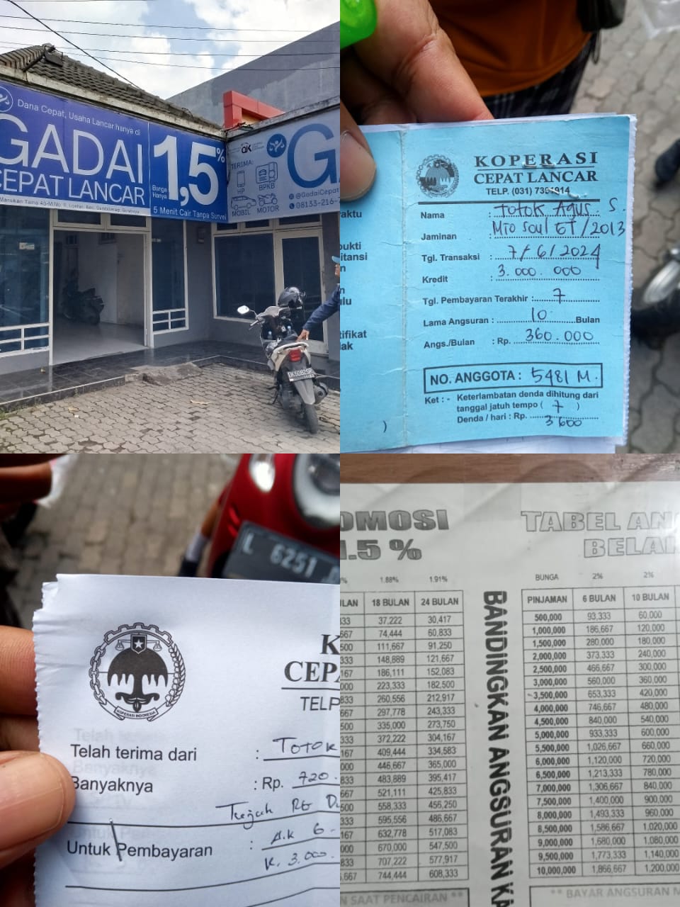 Hasil temuan tim investigasi diperkuat dengan adanya salah satu konsumen yang membayar angsuran dengan menunjukkan kwitansi bukti pembayaran yang bertuliskan Koperasi Simpan Pinjam Cepat Lancar. Salah satu tim awak media mewawancarai konsumen tersebut dan dari keterangan konsumen tersebut mengatakan bahwa mendapatkan pinjaman dari Koperasi dengan nominal sebesar Rp.3.000.000 ( tiga juta rupiah) dengan jaminan BPKB motor miliknya.
