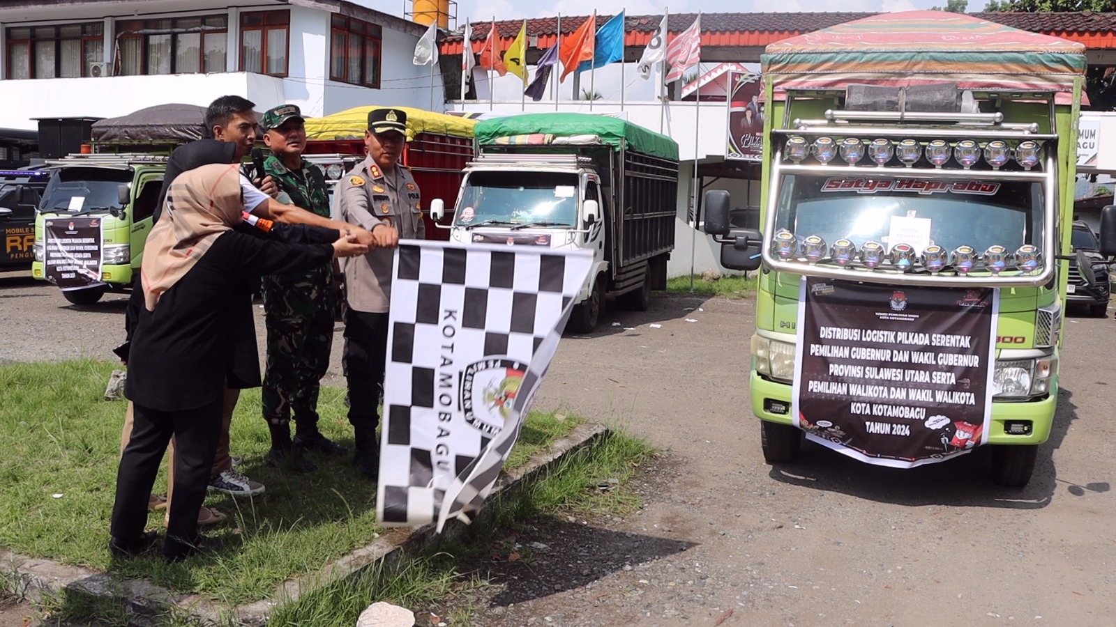 Kapolres AKBP Irwanto, SIK, MH bersama ketua KPU Kotamobagu, Dandim 1303 Bolmong serta pemerintah Kota Kotamobagu melepas secara resmi logistik Pilkada serentak untuk wilayah Kotamobagu dari kantor KPU ke masing-masing PPK.