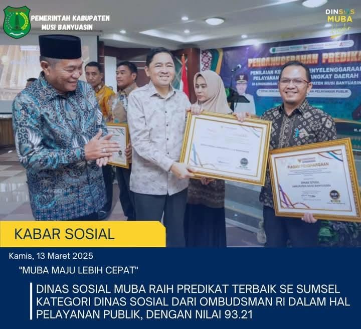Dinas Sosial Terbaik di Provinsi Sumsel yang lebih membanggakan, dalam penilaian tahun ini, Dinas Sosial Kabupaten Muba berhasil meraih nilai tertinggi di Provinsi Sumatera Selatan dalam kategori Dinas Sosial. Ini adalah prestasi yang patut dicontoh dan menjadi kebanggaan bagi masyarakat Muba.