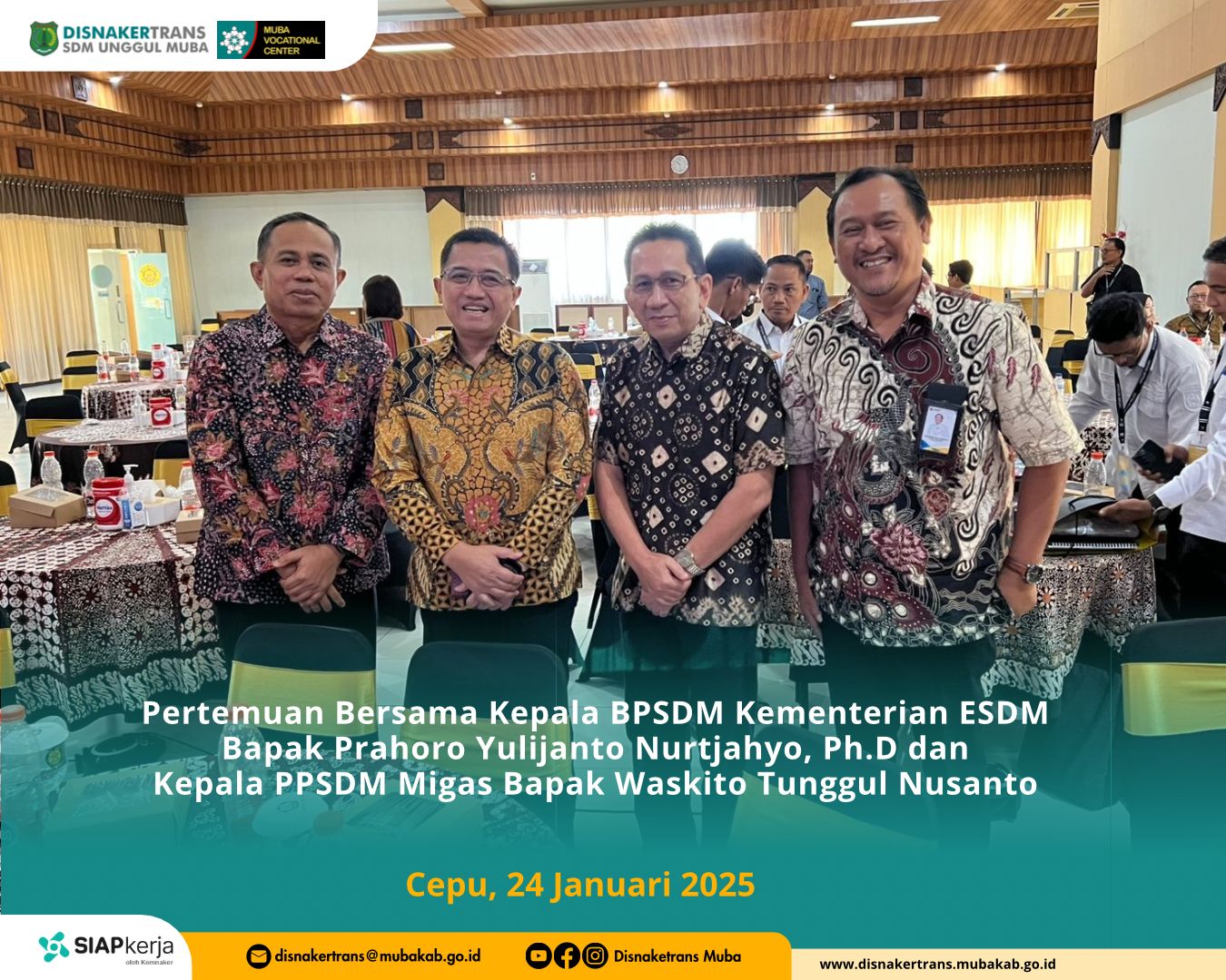 Dinas Tenaga Kerja dan Transmigrasi (Disnakertrans) Kabupaten Musi Banyuasin baru saja mencetak prestasi membanggakan dengan meraih penghargaan dari Pusat Pengembangan Sumber Daya Manusia Minyak dan Gas Bumi (PPSDM Migas). Penghargaan ini diberikan dalam acara “Partnership Gathering & Appreciation Day PPSDM Migas 2025”,yang berlangsung di Aula Lantai 3, Gedung Utama PPSDM Migas, Cepu, Blora.