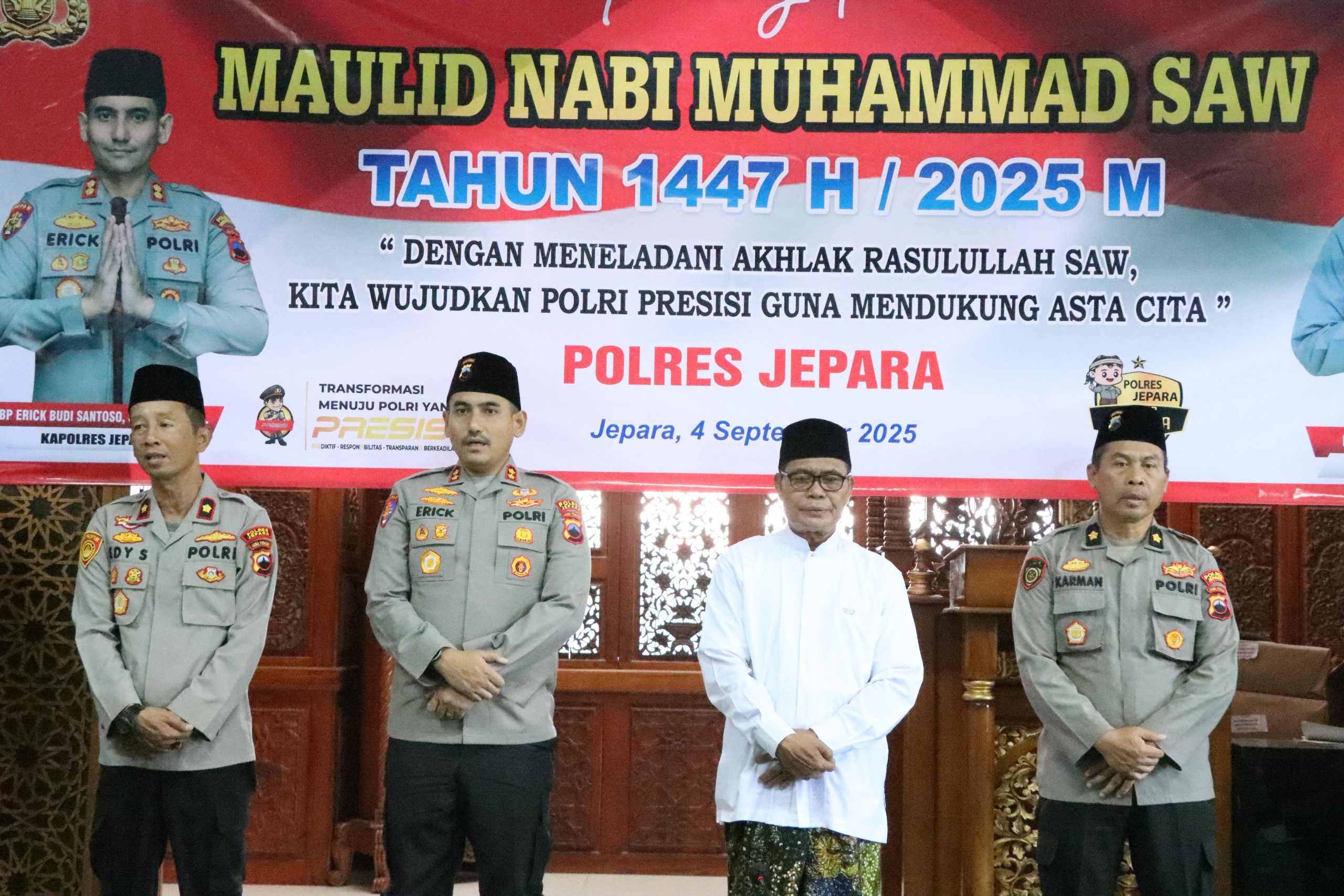 Kapolres Jepara AKBP Erick pun menyampaikan apresiasi atas terselenggaranya peringatan Maulid ini. Menurutnya, nilai kejujuran, amanah, dan kepedulian sosial yang diwariskan Rasulullah adalah pedoman penting bagi Polri.