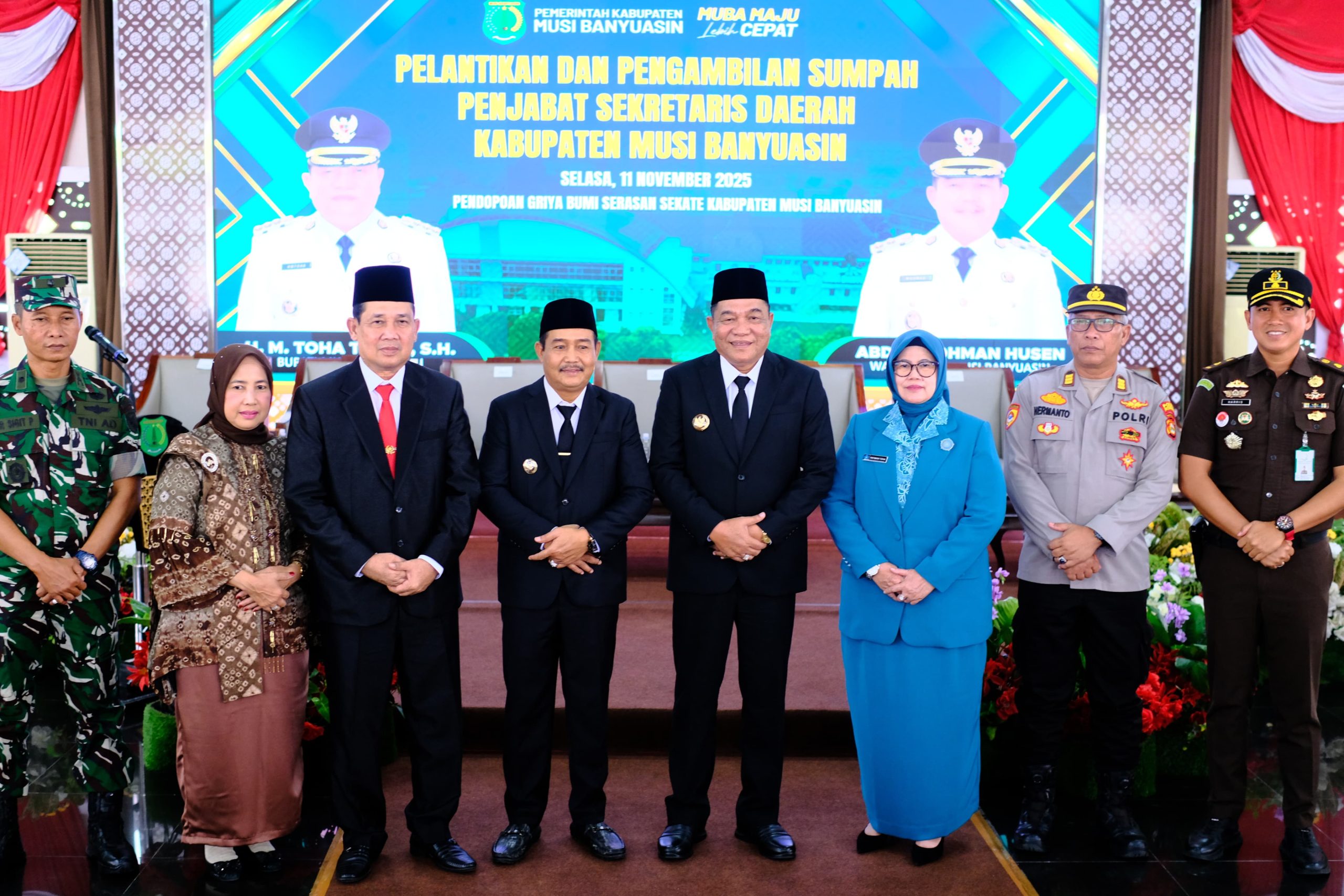Bupati Musi Banyuasin H M Toha Tohet SH secara resmi melantik Drs Syafaruddin MSi sebagai Penjabat Sekretaris Daerah Kabupaten Musi Banyuasin, dalam pelantikan yang digelar di Pendopoan Griya Bumi Serasan Sekate, Selasa (11/11/2025).