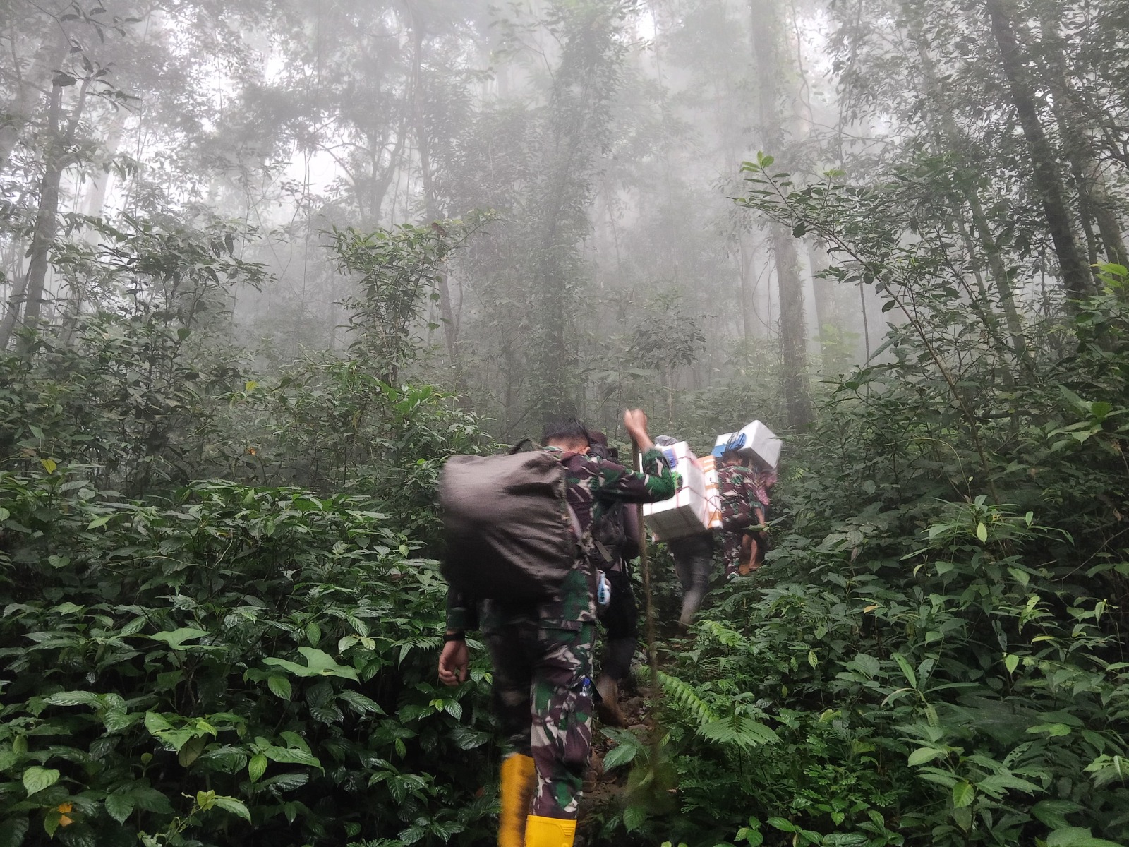 Kondisi hujan dan jalan yang licin serta banyaknya akar pohon disepanjang jalur membuat aparat pengawalan harus esktra hati-hati.