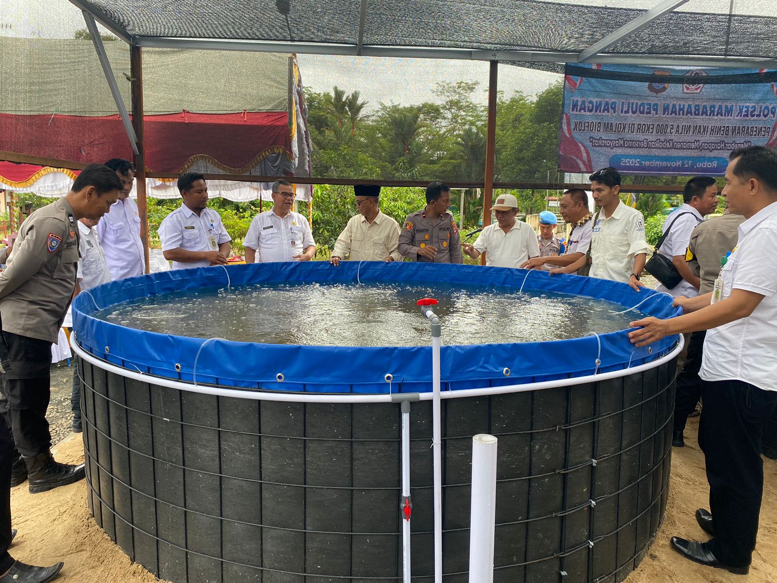 Dalam rangka mendukung program ketahanan pangan nasional, Polres Barito Kuala, Polsek Marabahan melaksanakan kegiatan penebaran bibit ikan nila di kolam bioflok yang berlokasi di halaman Mapolsek Marabahan, Kabupaten Barito Kuala, pada Rabu (12/11/2025) pagi