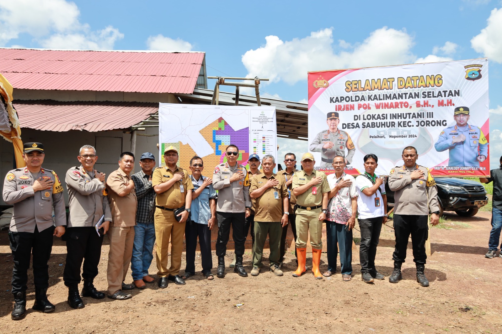 Kapolda Kalimantan Selatan Irjen Pol Winarto, S.H., M.H., melaksanakan kunjungan kerja ke Desa Sabuhur, Kecamatan Jorong, Kabupaten Tanah Laut, Selasa (5/11/2024) dalam rangka pengecekan lokasi lahan dan tatap muka dengan kelompok tani dan sebagai bentuk dukungan terhadap program ketahanan pangan yang diinisiasi oleh Presiden Republik Indonesia Prabowo Subianto.