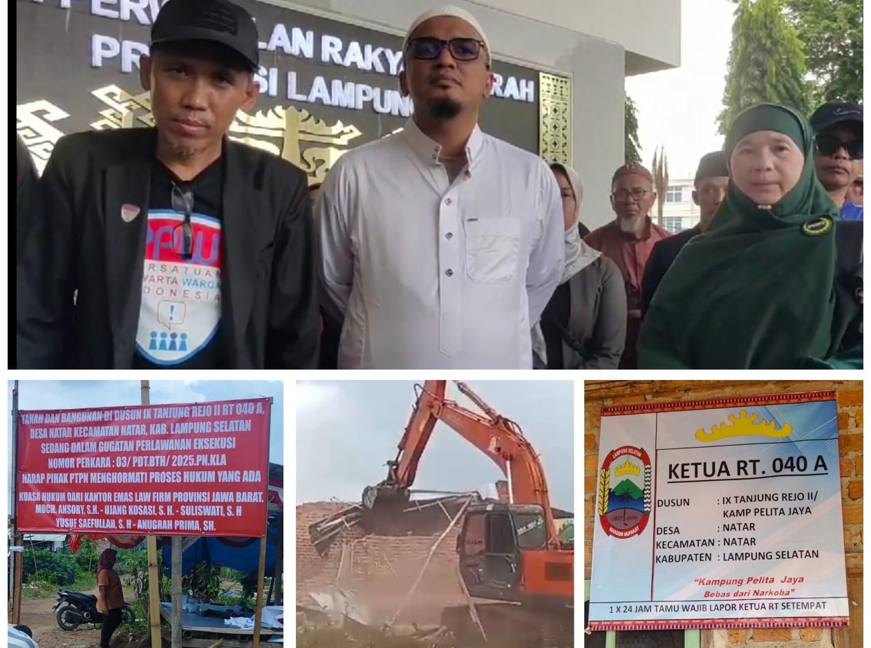 Masyarakat Dusun 9 Tanjung Rejo II, RT 040, Desa Natar, Kecamatan Natar, Kabupaten Lampung Selatan, terus berjuang melawan ketidakadilan. Ditemani organisasi peduli kemanusiaan, mereka mendatangi Kantor DPRD Provinsi Lampung, Jumat, 10 Januari 2025, guna meminta perhatian atas penggusuran brutal yang dilakukan oleh PTPN 1 Regional 7 pada 4 Januari 2025.